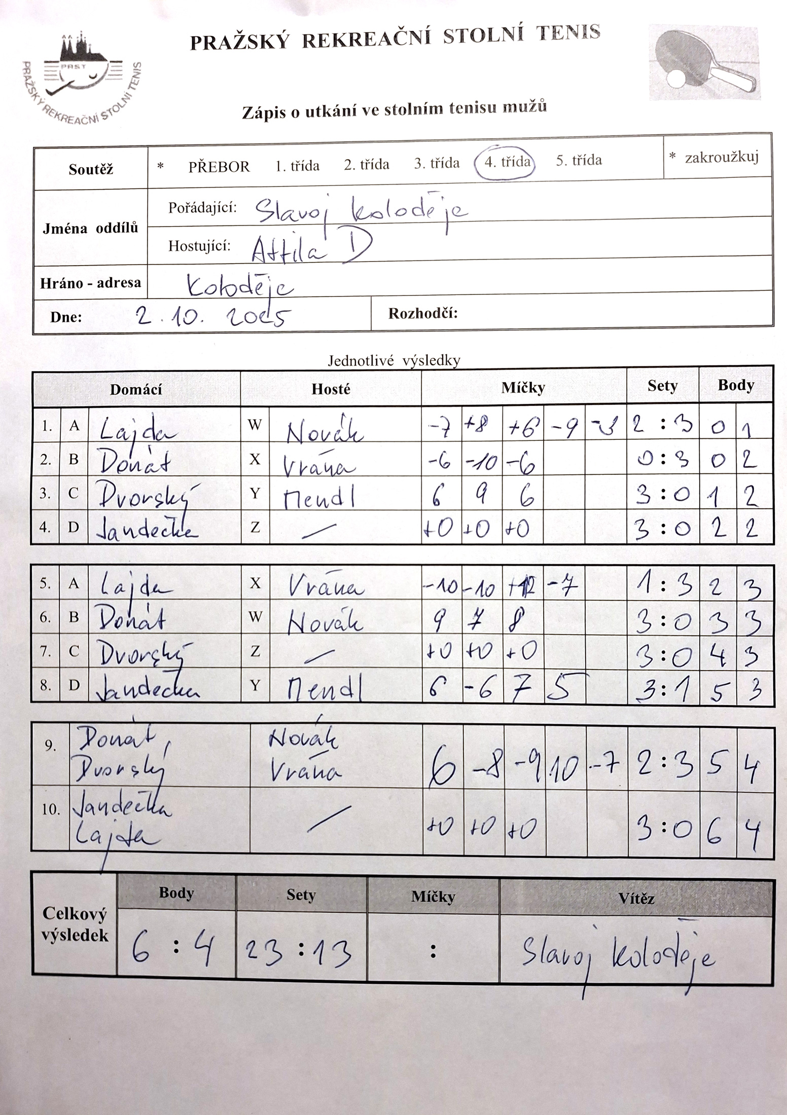 7 | Slavoj Koloděje | Attila D | 6 : 4 | čt 02.10.2025 18:30 | | | 03.10.2025 01:40 petrdo |