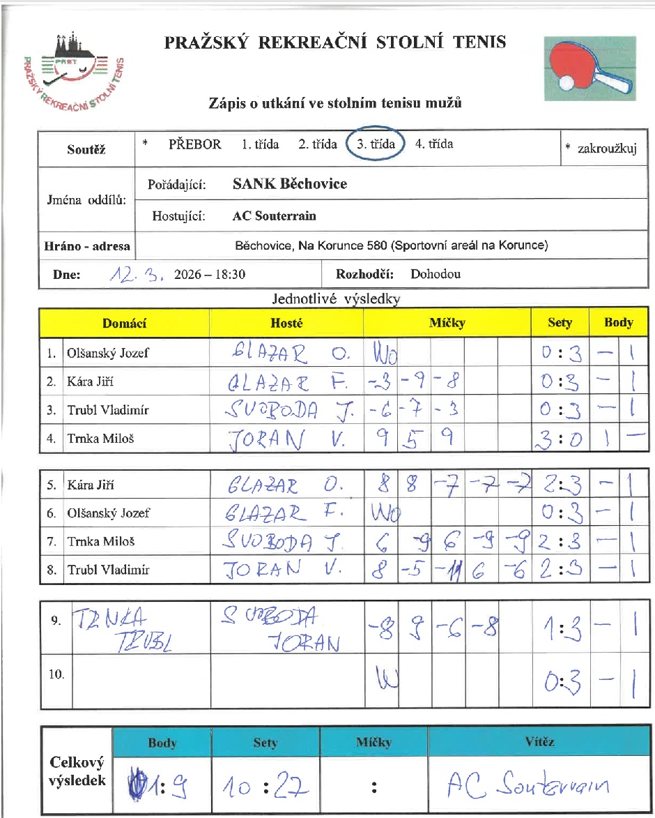 | 6 | SANK Běchovice | AC Souterrain | 1 : 9 | čt 12.03.2026 18:30 | | | 12.03.2026 20:19 milos. |