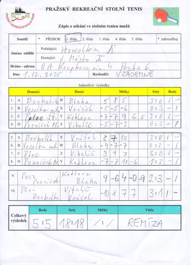 | 4/6 | Nem. Na Homolce A | Attila A | 4 : 6 | po 06.10.2025 18:45 | | | 07.10.2025 11:28 poclan |