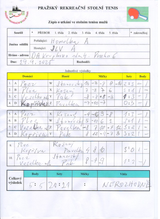 | 2/2 | JLV A | Attila A | 5 : 5 | čt 25.09.2025 18:00 | | | 25.09.2025 23:03 prst.j |