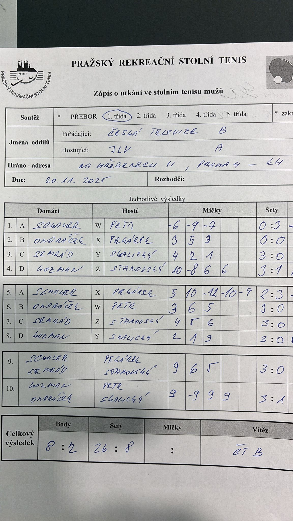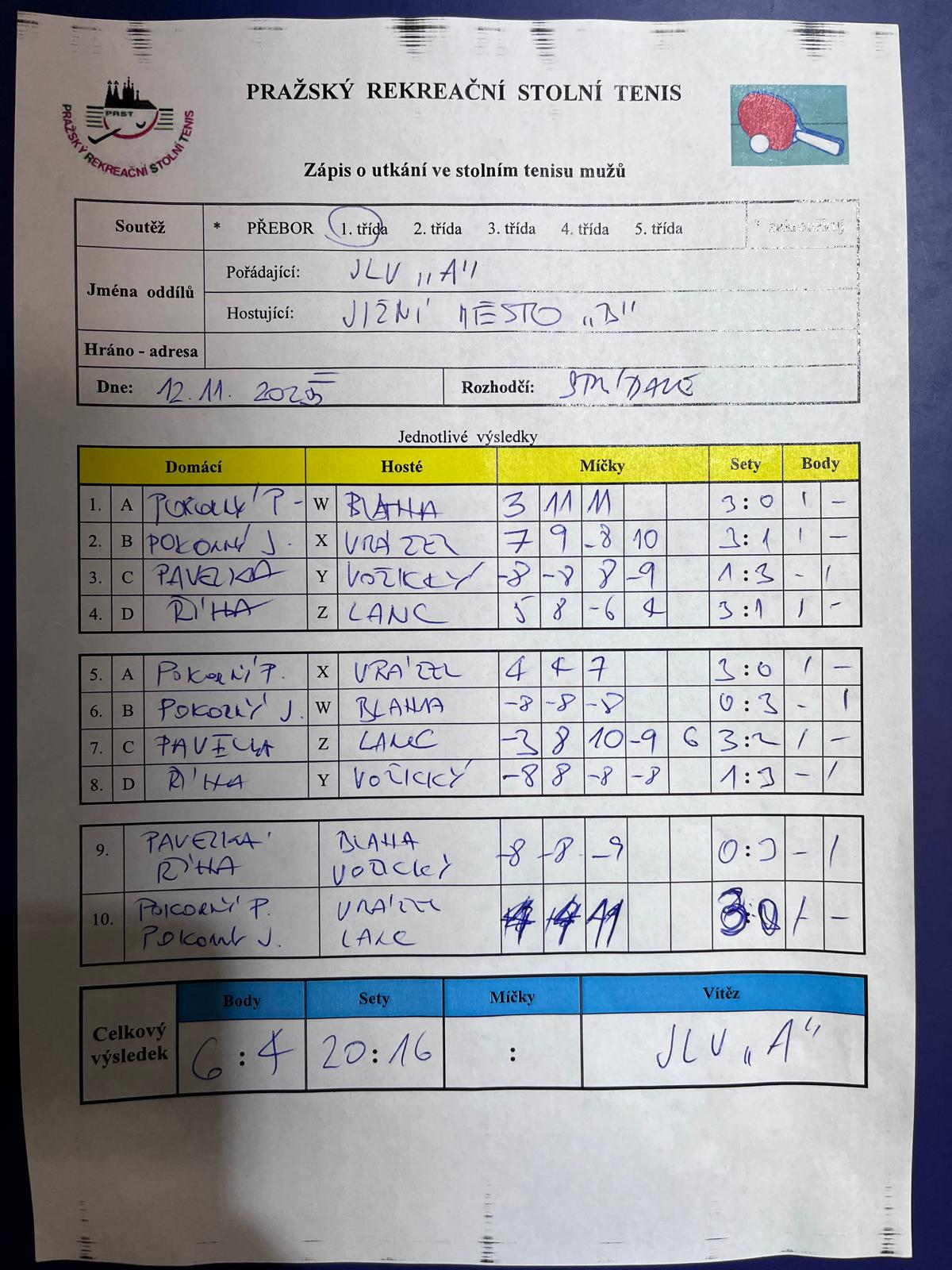 | 6/2 | JLV A | Orion Modřany B | 3 : 7 | út 18.11.2025 18:00 | | | 18.11.2025 20:35 prst.j |