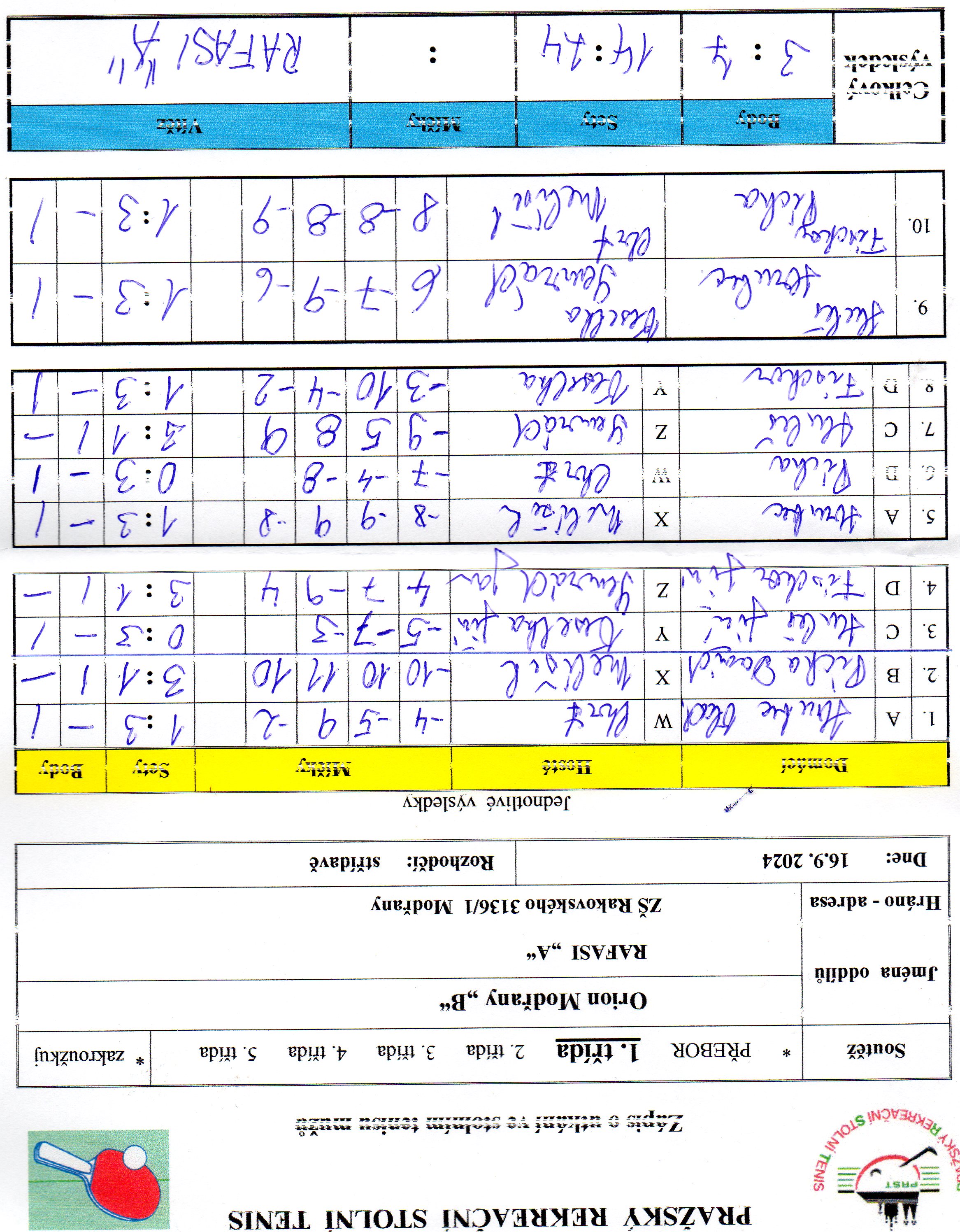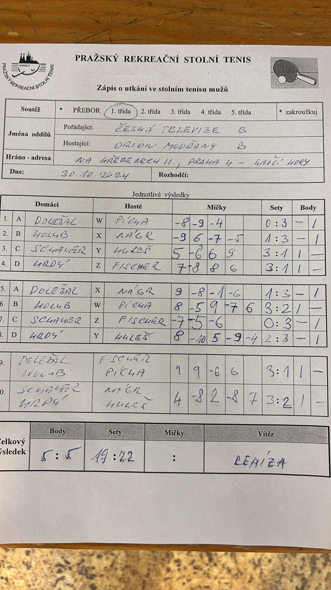 | 3/6 | Orion Modřany B | Stodůlky B | 4 : 6 | po 29.09.2025 19:10 | | | 30.09.2025 10:09 radek. |