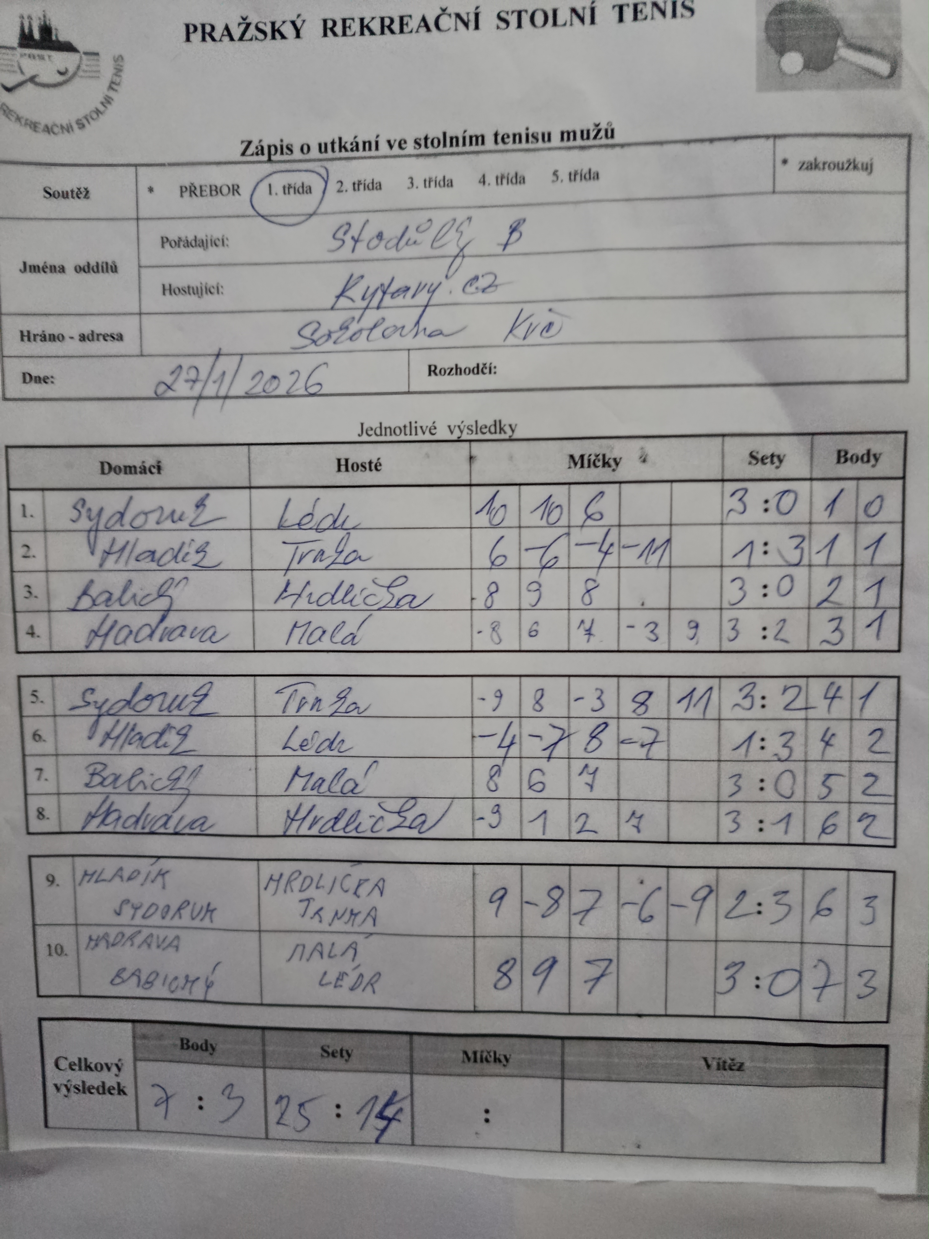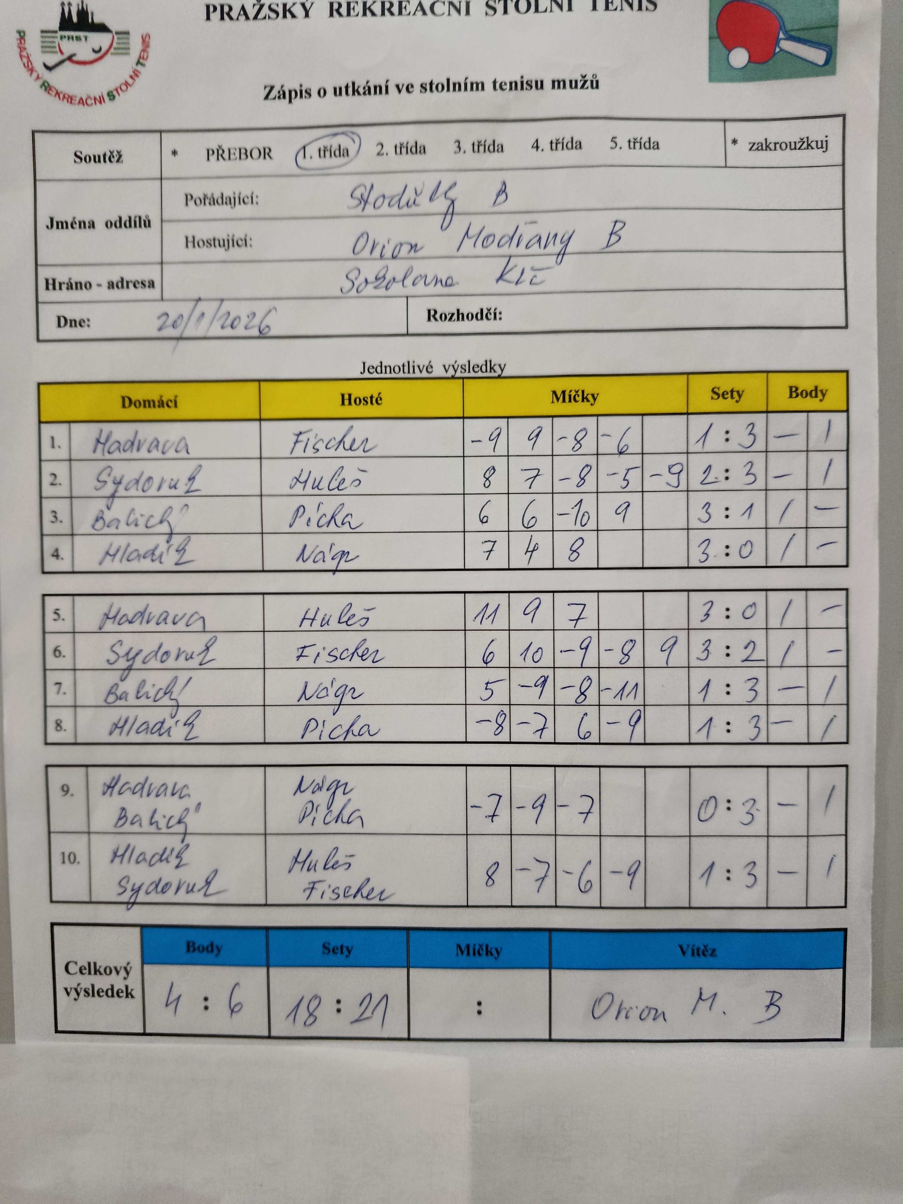 | 14/6 | Stodůlky B | Orion Modřany B | 4 : 6 | út 20.01.2026 18:00 | | | 21.01.2026 01:28 milosl |