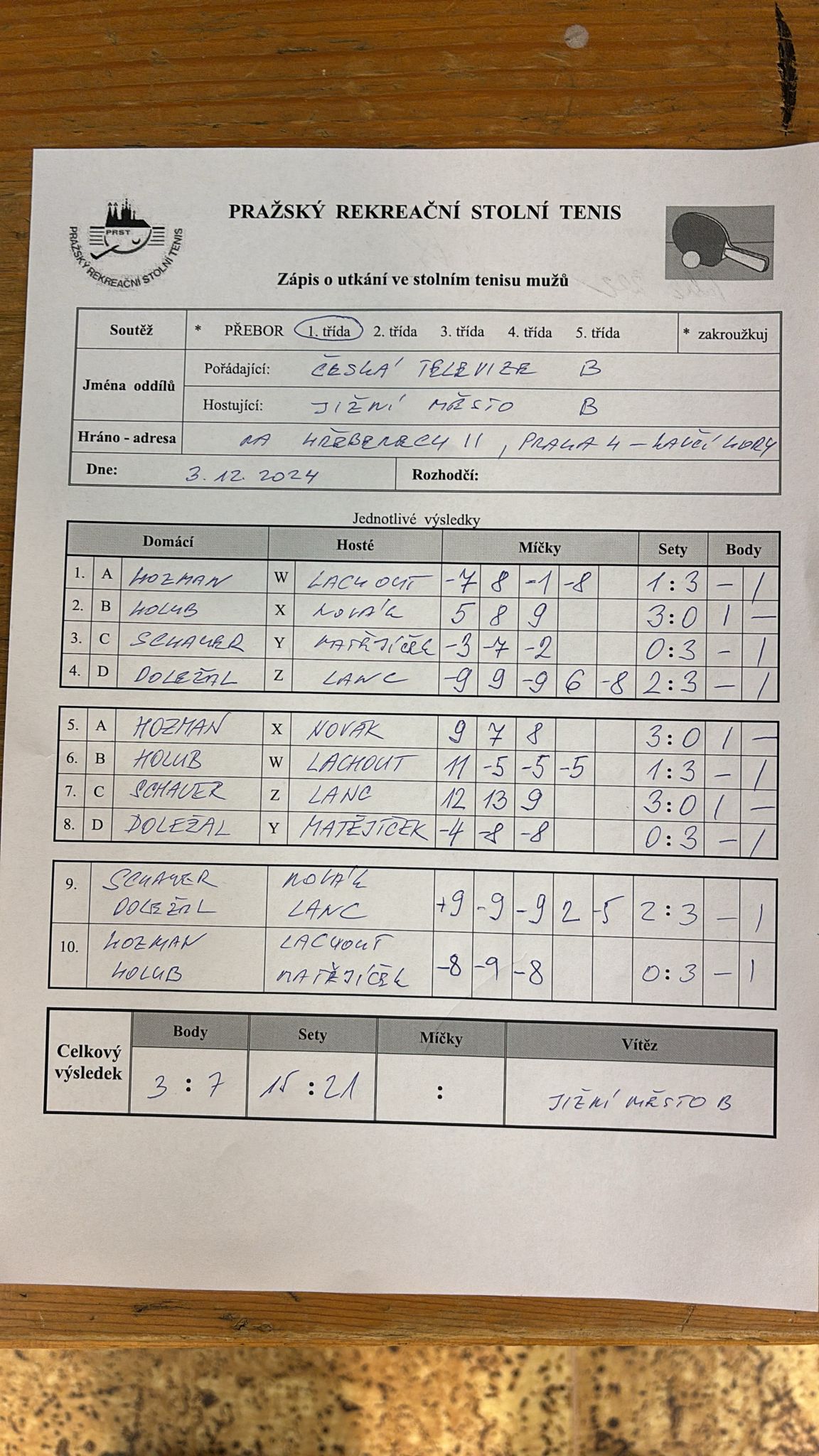| 10/6 | Slivenec B | Česká televize B | 6 : 4 | po 01.12.2025 18:45 | | | 01.12.2025 20:46 arbrat |