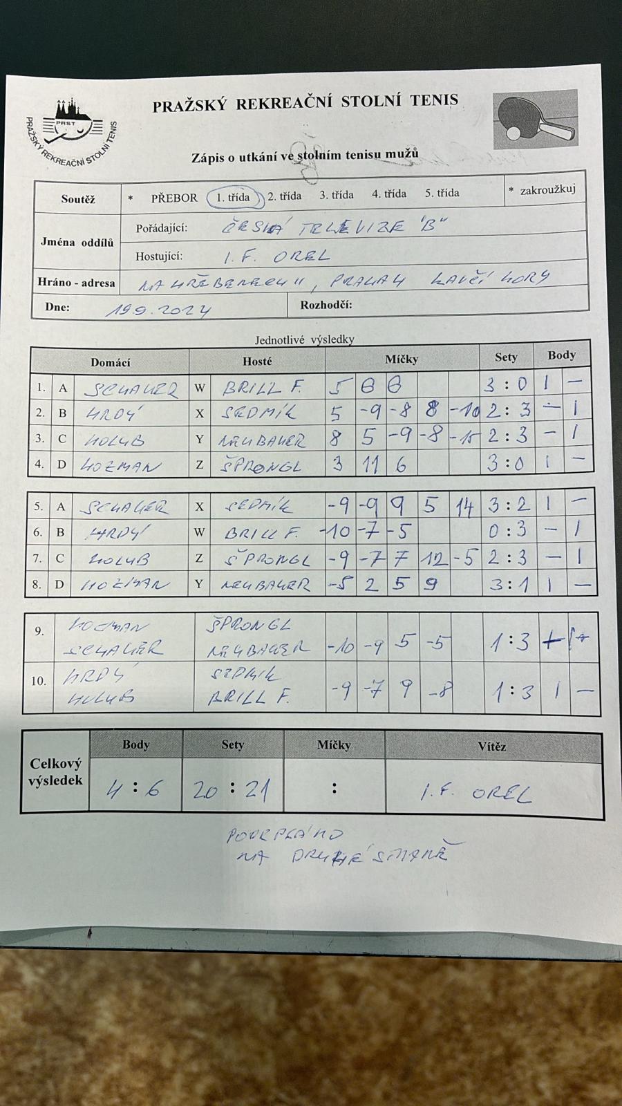 | 1/6 | Česká televize B | Orion Modřany B | 8 : 2 | čt 18.09.2025 18:00 | | | 19.09.2025 08:43 radek. |