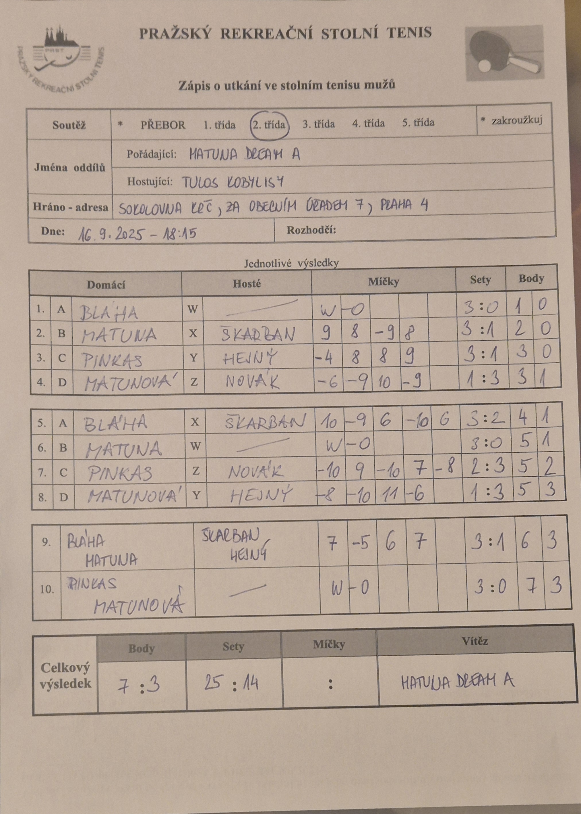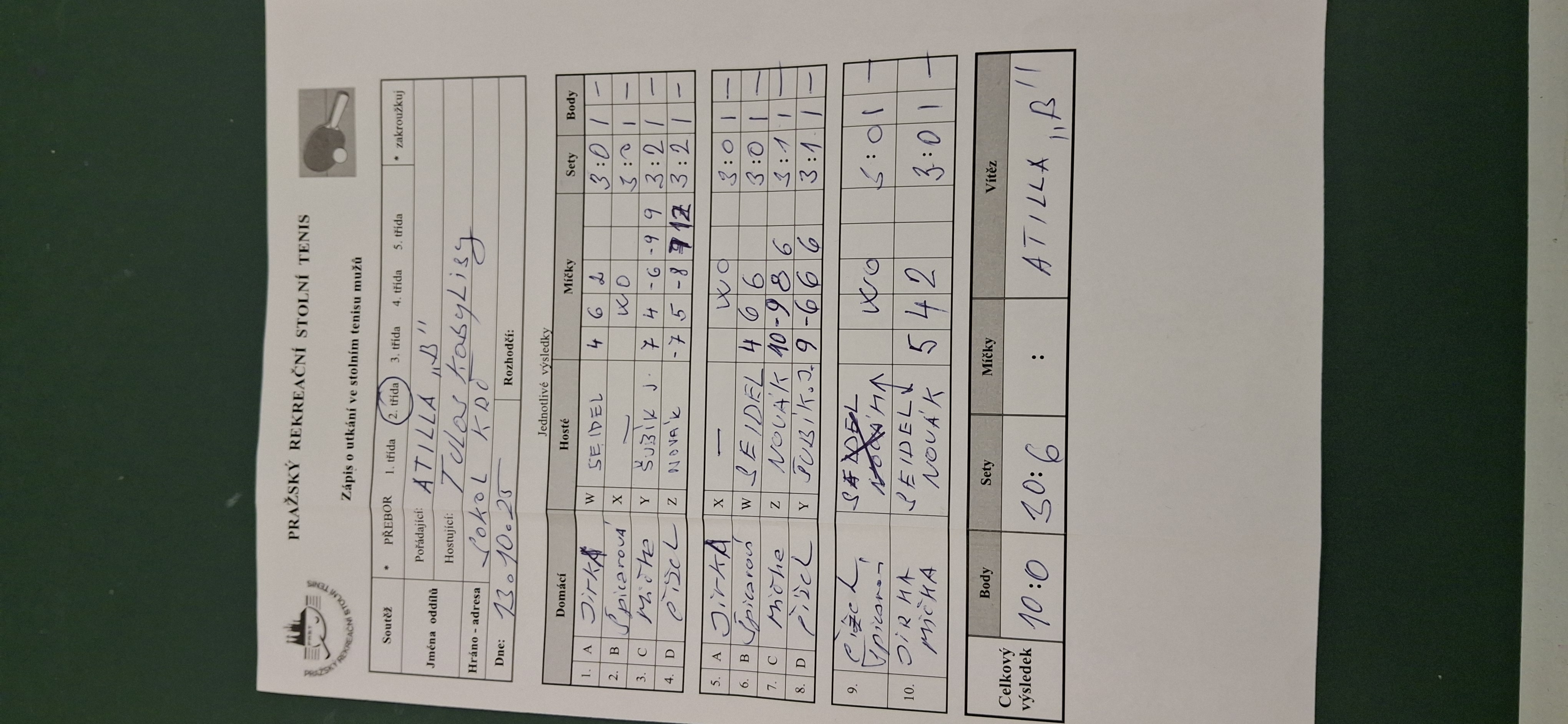 | 13/2 | Attila B | Tulos Kobylisy | 1 : 9 | po 02.02.2026 20:00 | | | 03.02.2026 12:27 radek. |