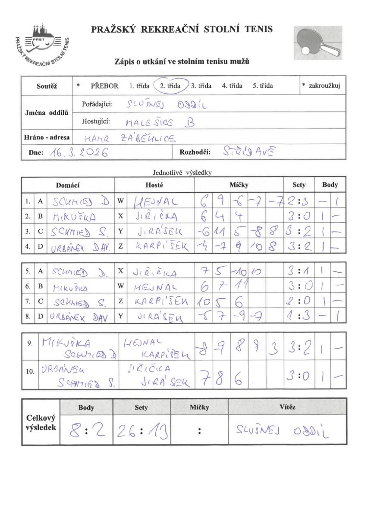 | 16/5 | Slušnej oddíl | Malešice B | 8 : 2 | po 16.03.2026 20:00 | | | 16.03.2026 22:07 s.schm |