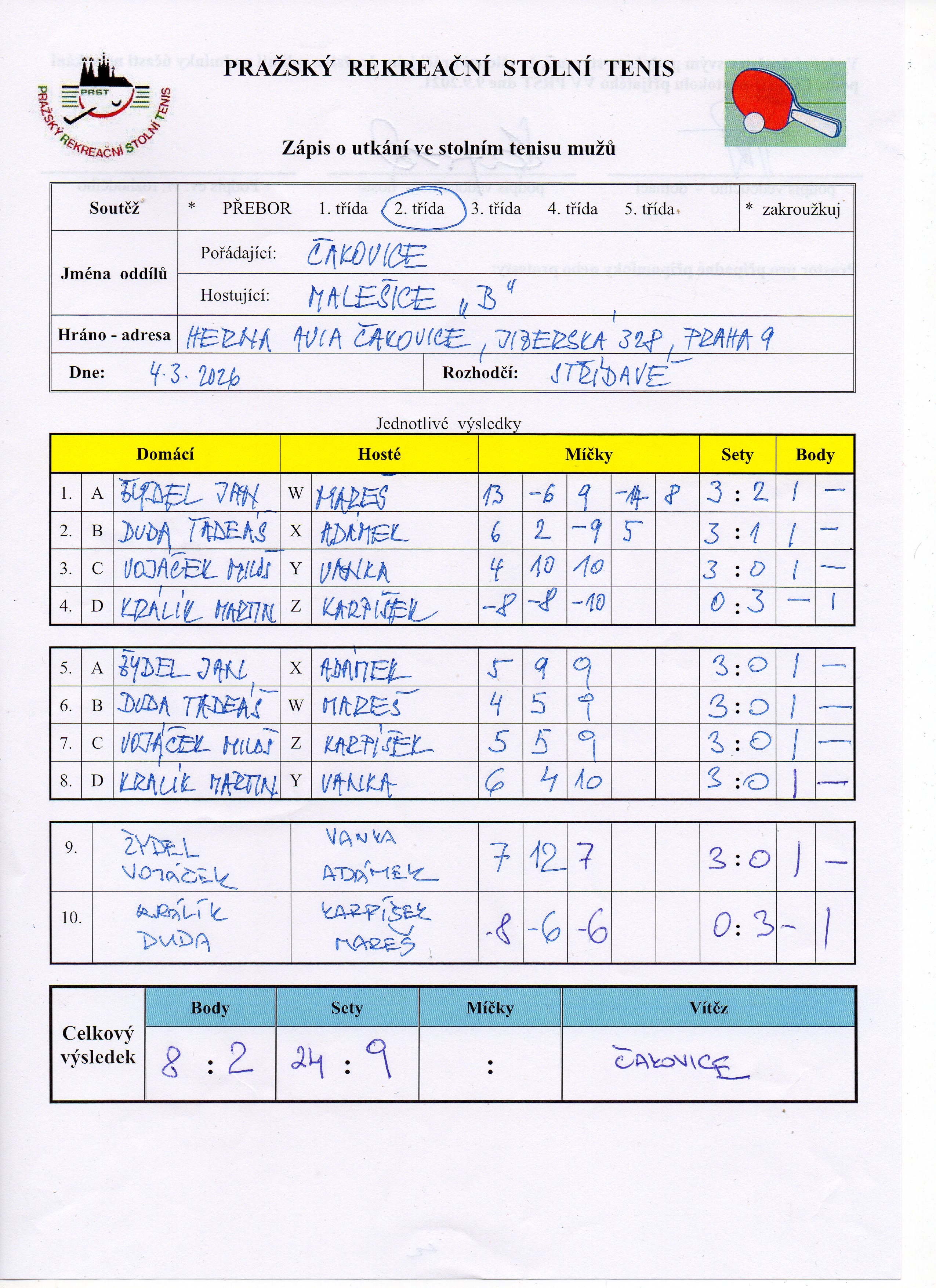 | 20/3 | Attila B | Malešice B | email: DOM HOS | po 23.03.2026 20:00 | | | 15.03.2026 19:36 c.venc |