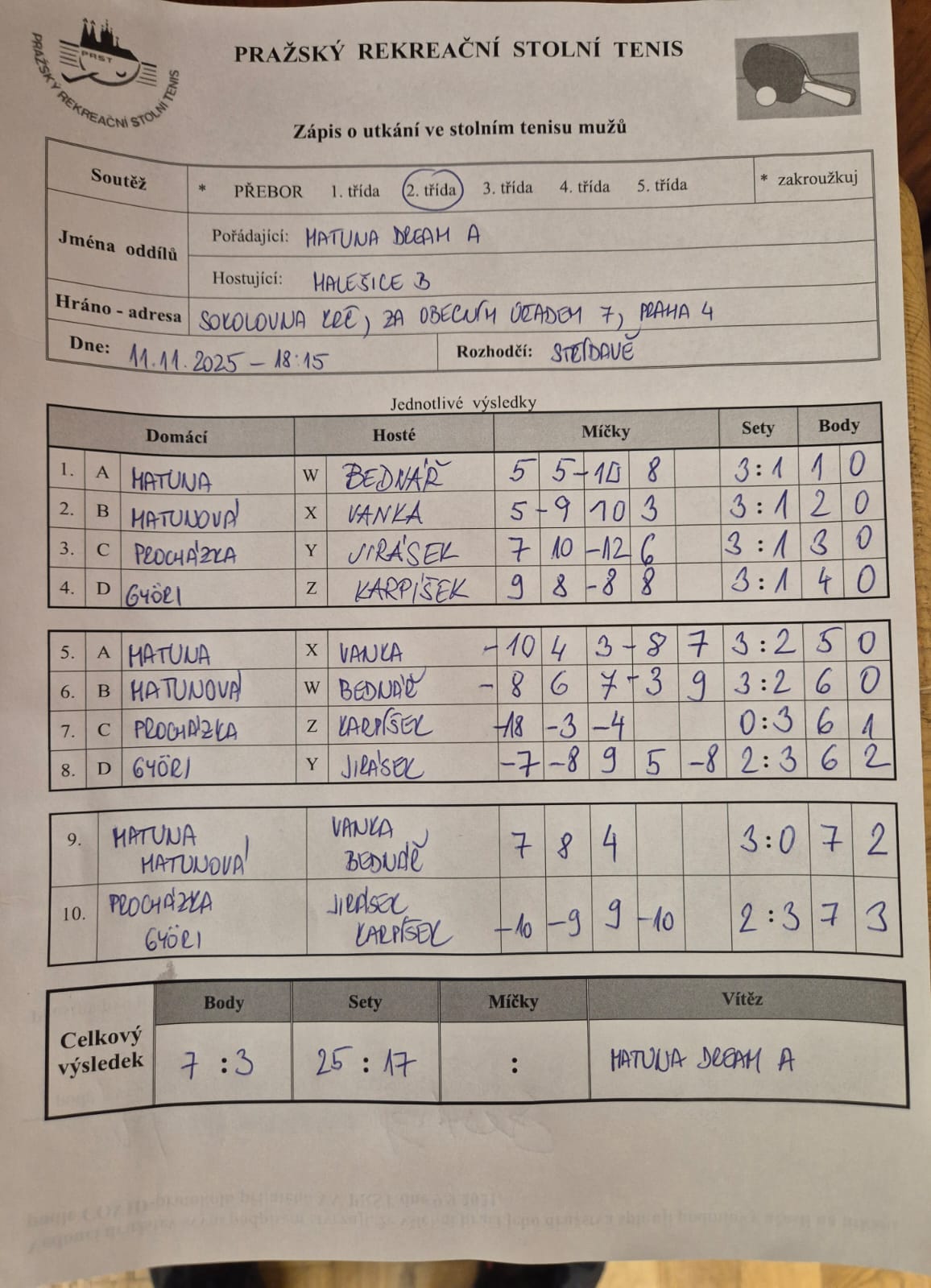 | 9/3 | Malešice B | Attila B | 3 : 7 | st 26.11.2025 19:15 | | | 27.11.2025 10:46 karpis |