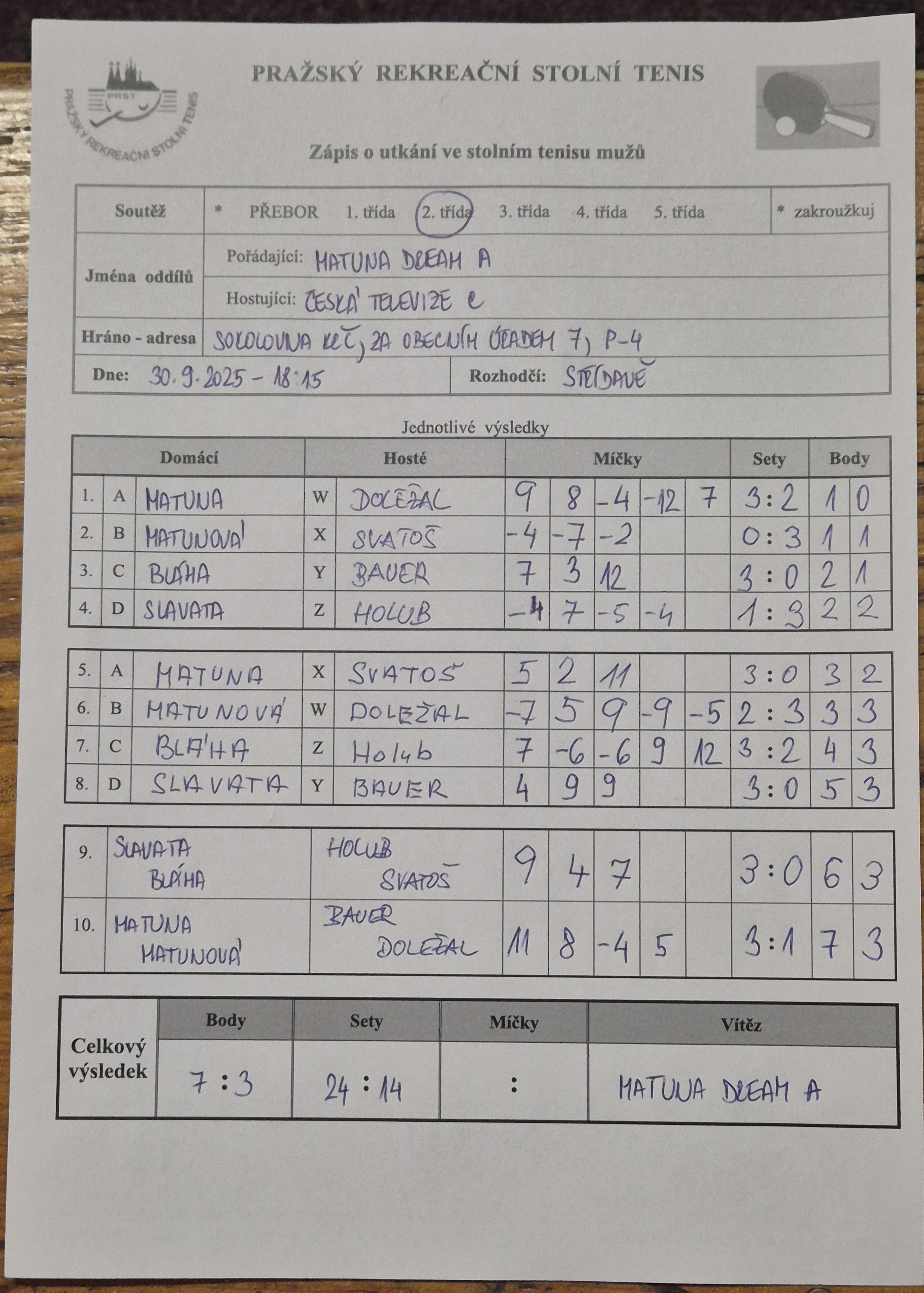 | 3/2 | Matuna Dream A | Česká televize C | 7 : 3 | út 30.09.2025 18:15 | | | 30.09.2025 20:14 matuna |