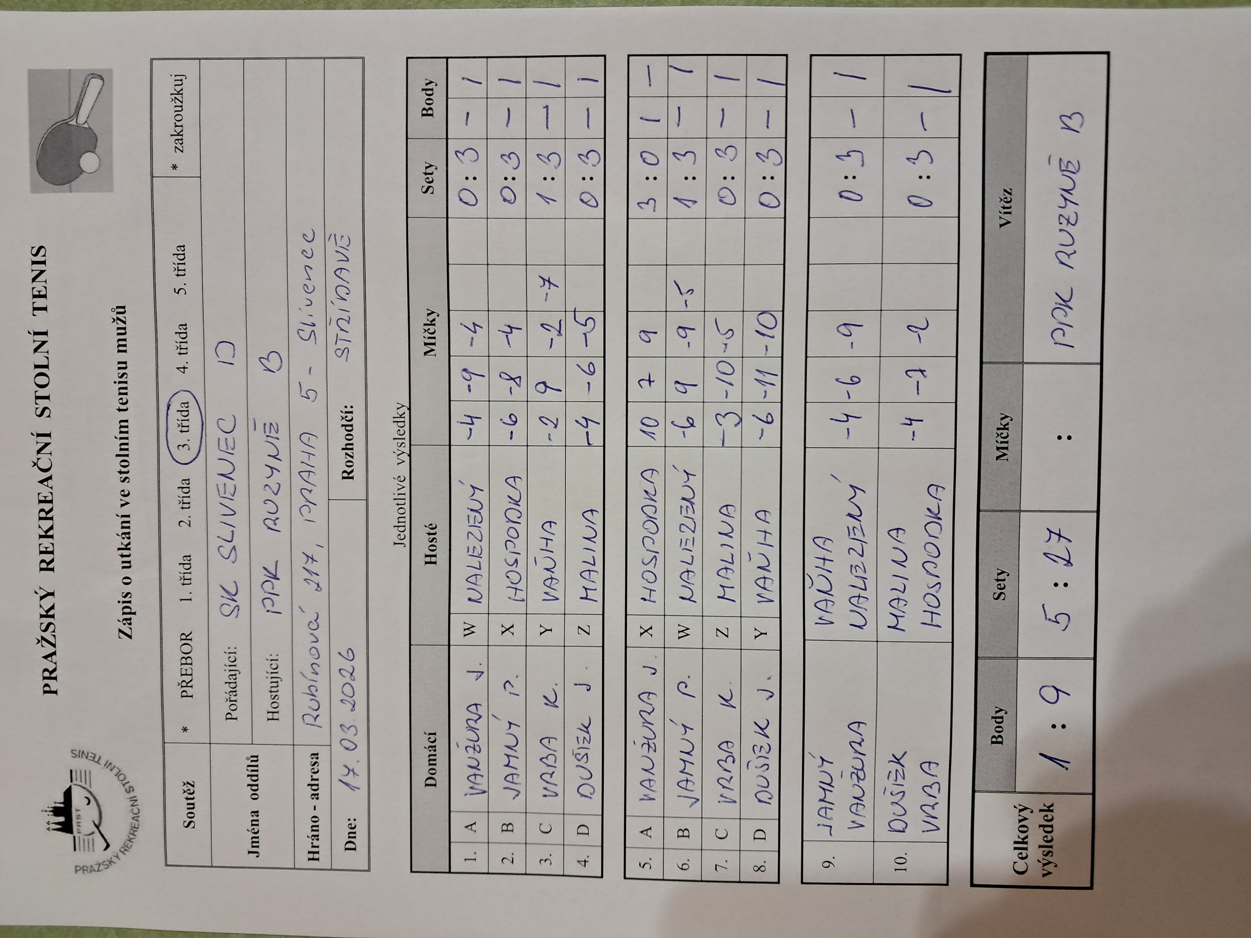 | 17/4 | PPK Ruzyně B | RAFASI B | 4 : 6 | po 23.02.2026 19:20 | | | 24.02.2026 07:33 honza. |