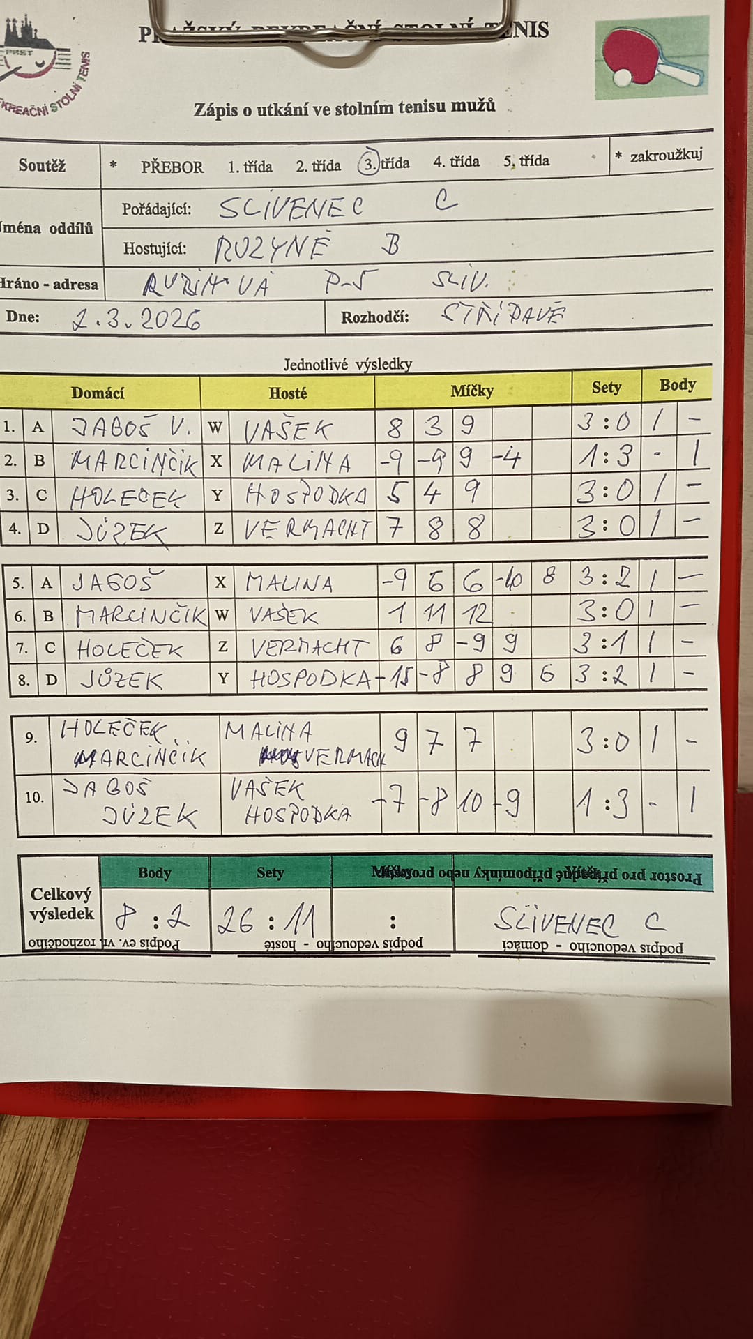 | 20/2 | Slivenec C | Matuna Dream B | email: DOM HOS | čt 26.03.2026 18:00 | | | 17.03.2026 14:16 v.jago |