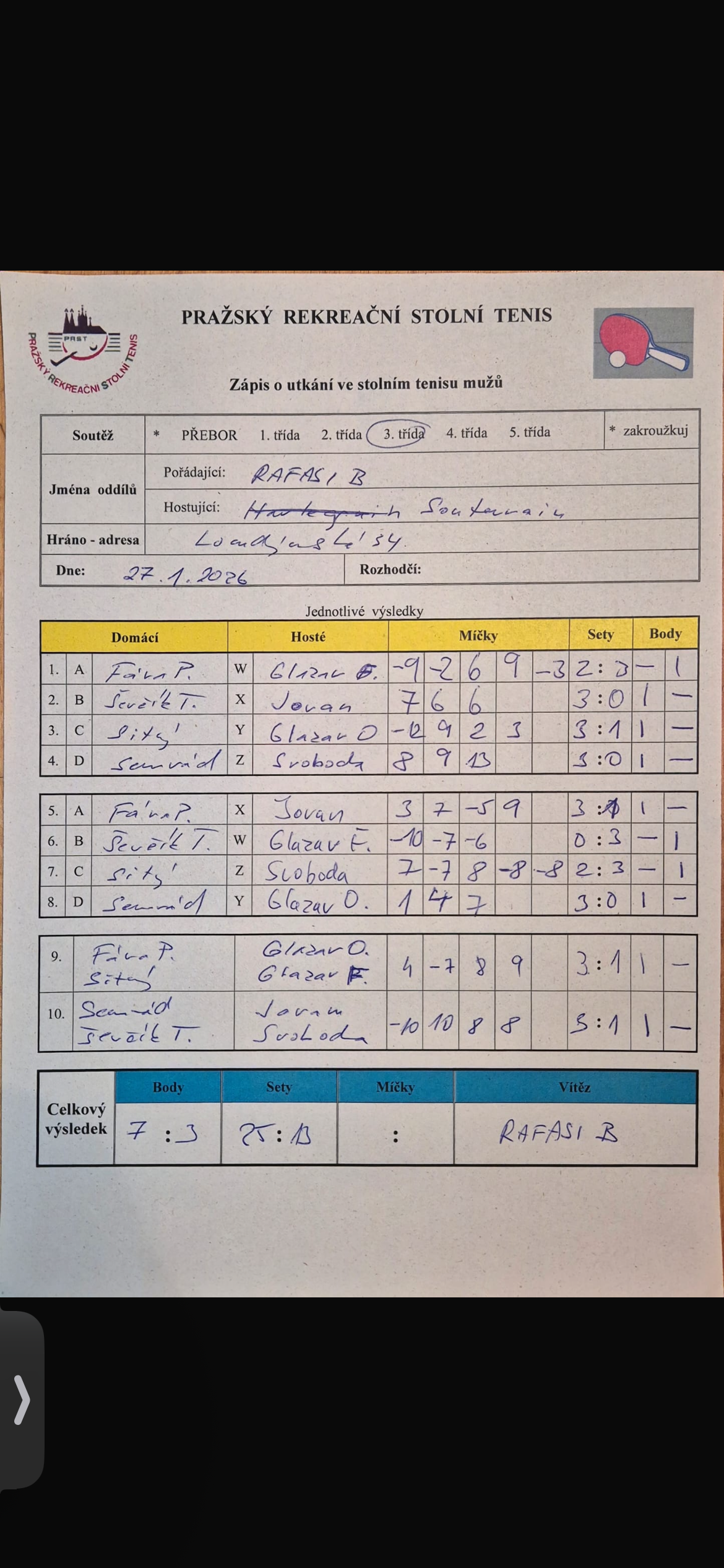 | 15/5 | AC Souterrain | RAFASI B | 3 : 7 | út 27.01.2026 20:00 | herna RAFASI | | 28.01.2026 09:33 radek. |