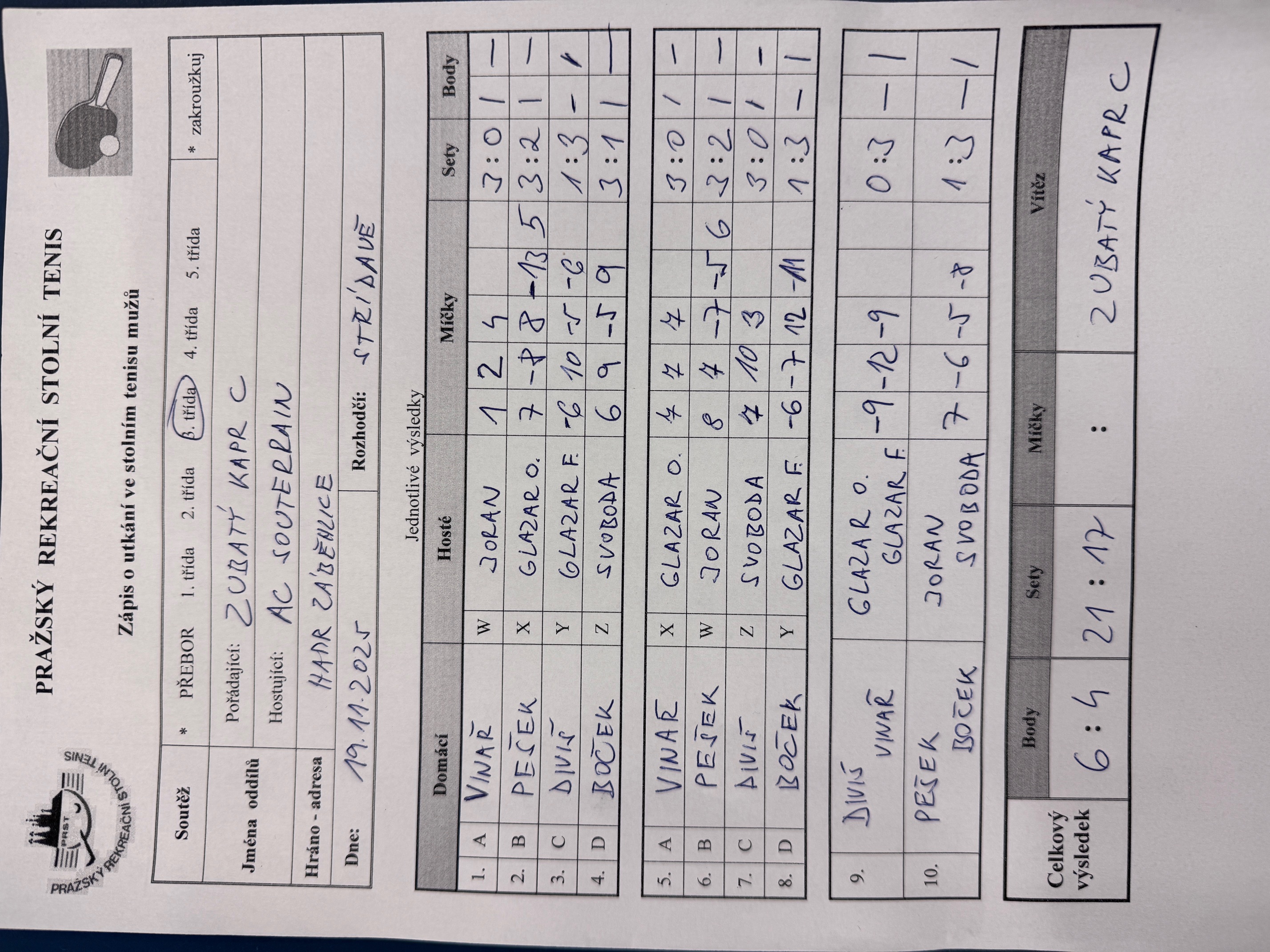| 6/6 | Zubatý kapr C | AC Souterrain | 6 : 4 | st 19.11.2025 20:00 | | | 20.11.2025 09:59 odivis |