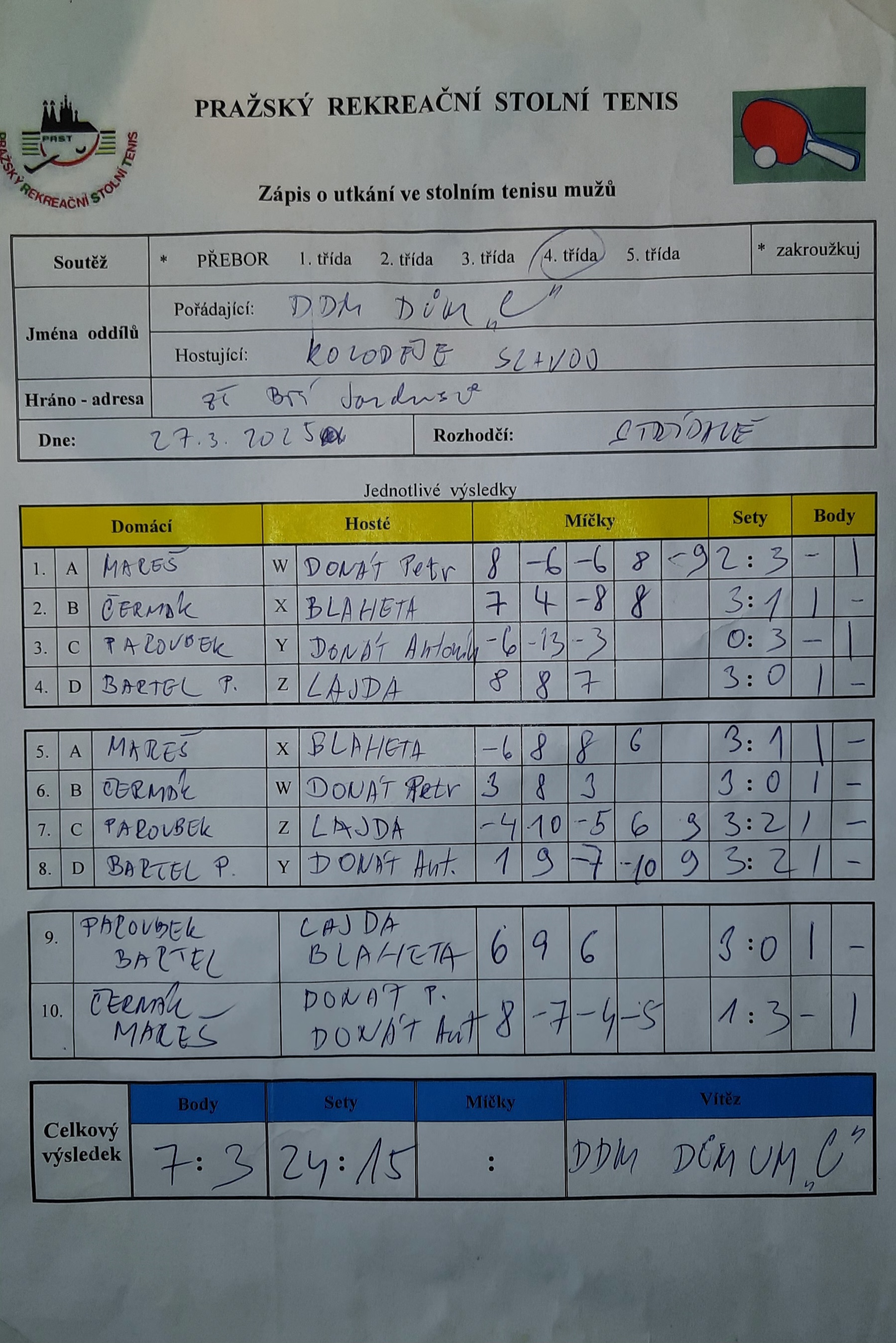 | 20/3 | DDM Praha 10 C | PPK Ruzyně C | email: DOM HOS | 23.02. - 26.02. | hrací den: čtvrtek 20:00 | | .. : |
