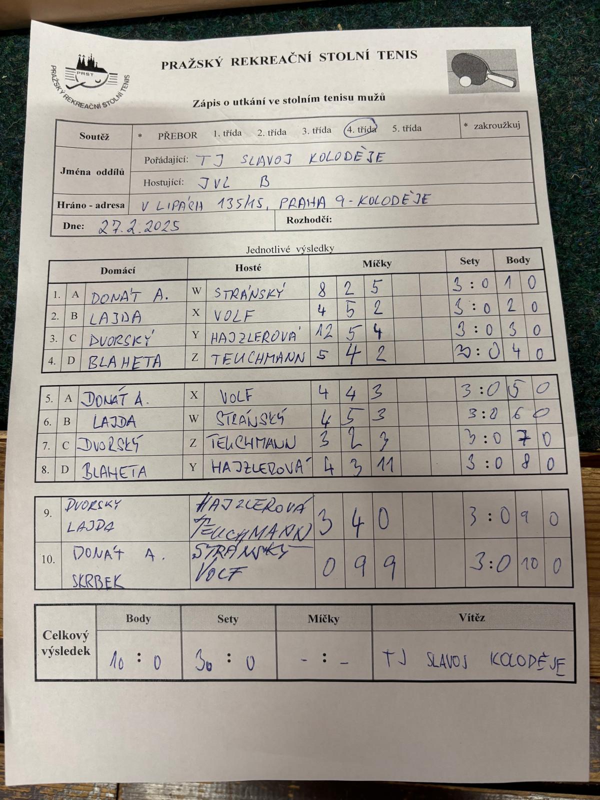 | 12/6 | JLV B | Slavoj Koloděje | 7 : 3 | po 08.12.2025 20:00 | | | 08.12.2025 23:50 ok1mpt |