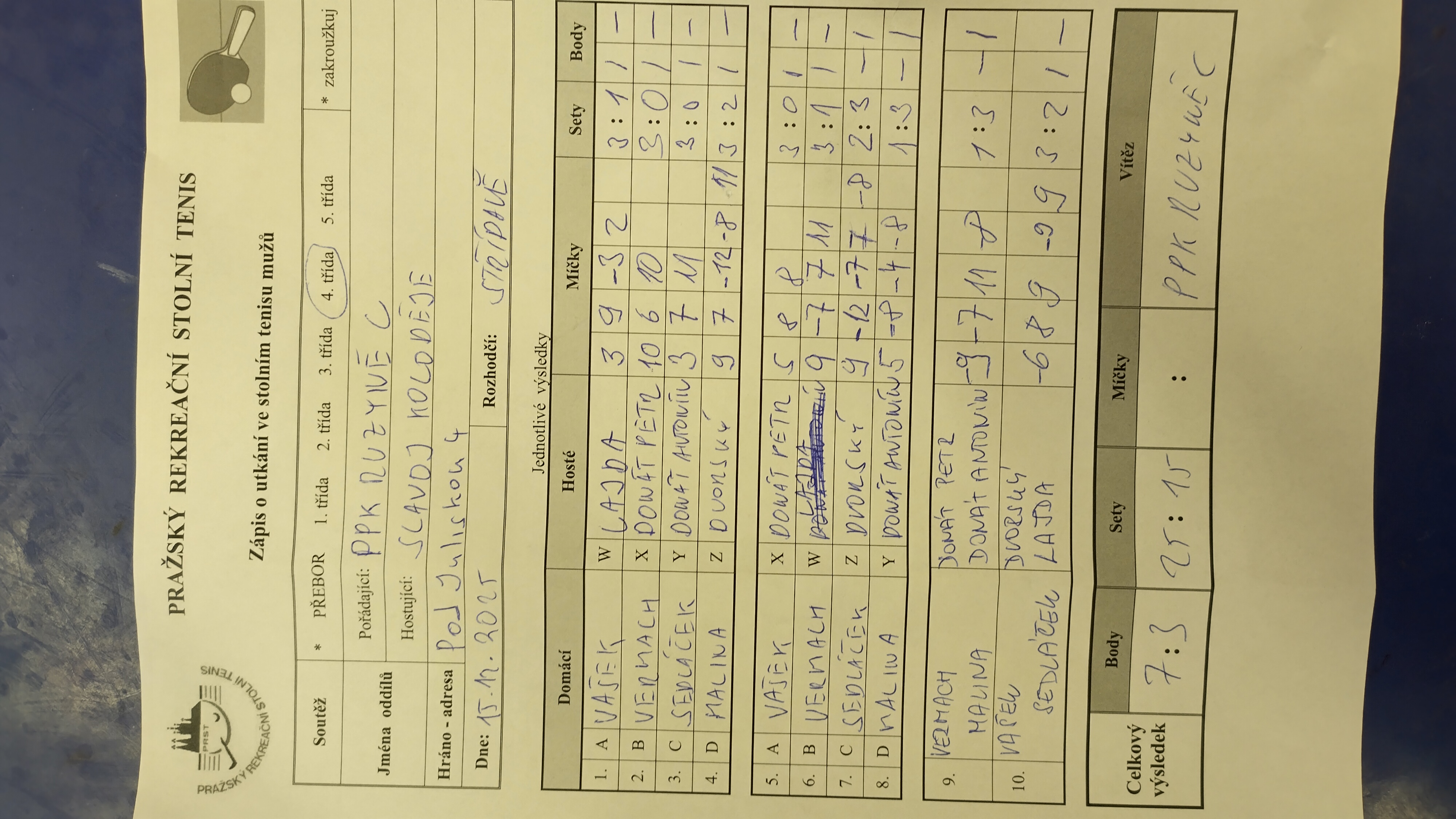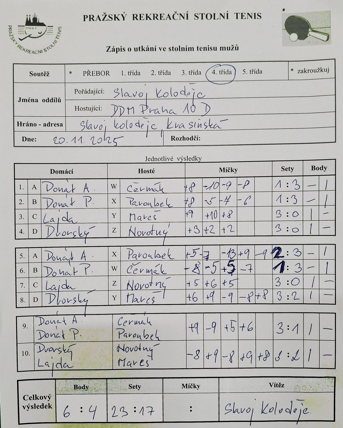 | 9/4 | Slavoj Koloděje | DDM Praha 10 C | 6 : 4 | čt 20.11.2025 18:30 | | | 20.11.2025 22:54 petrdo |