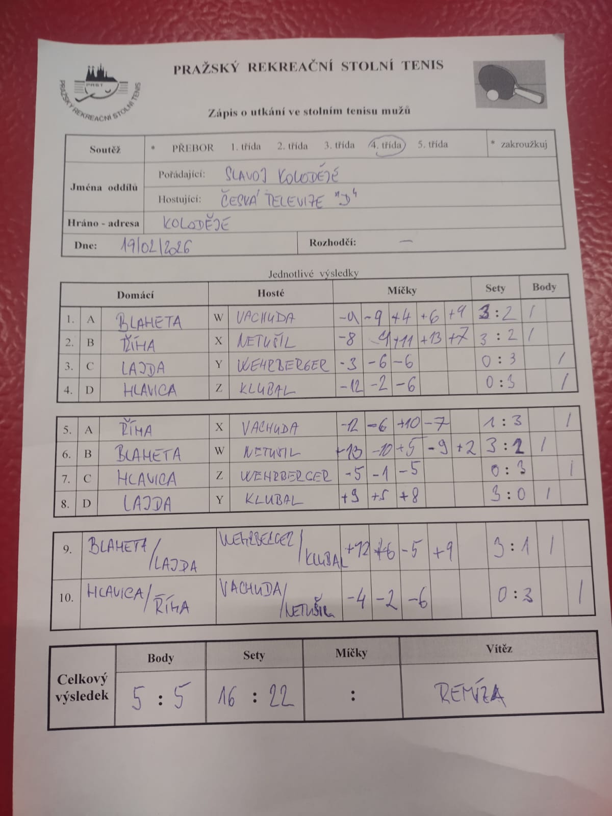 | 20/5 | Torisol | Slavoj Koloděje | 4 : 6 | čt 05.03.2026 18:45 | herna Koloděje | | 05.03.2026 23:08 petrdo |