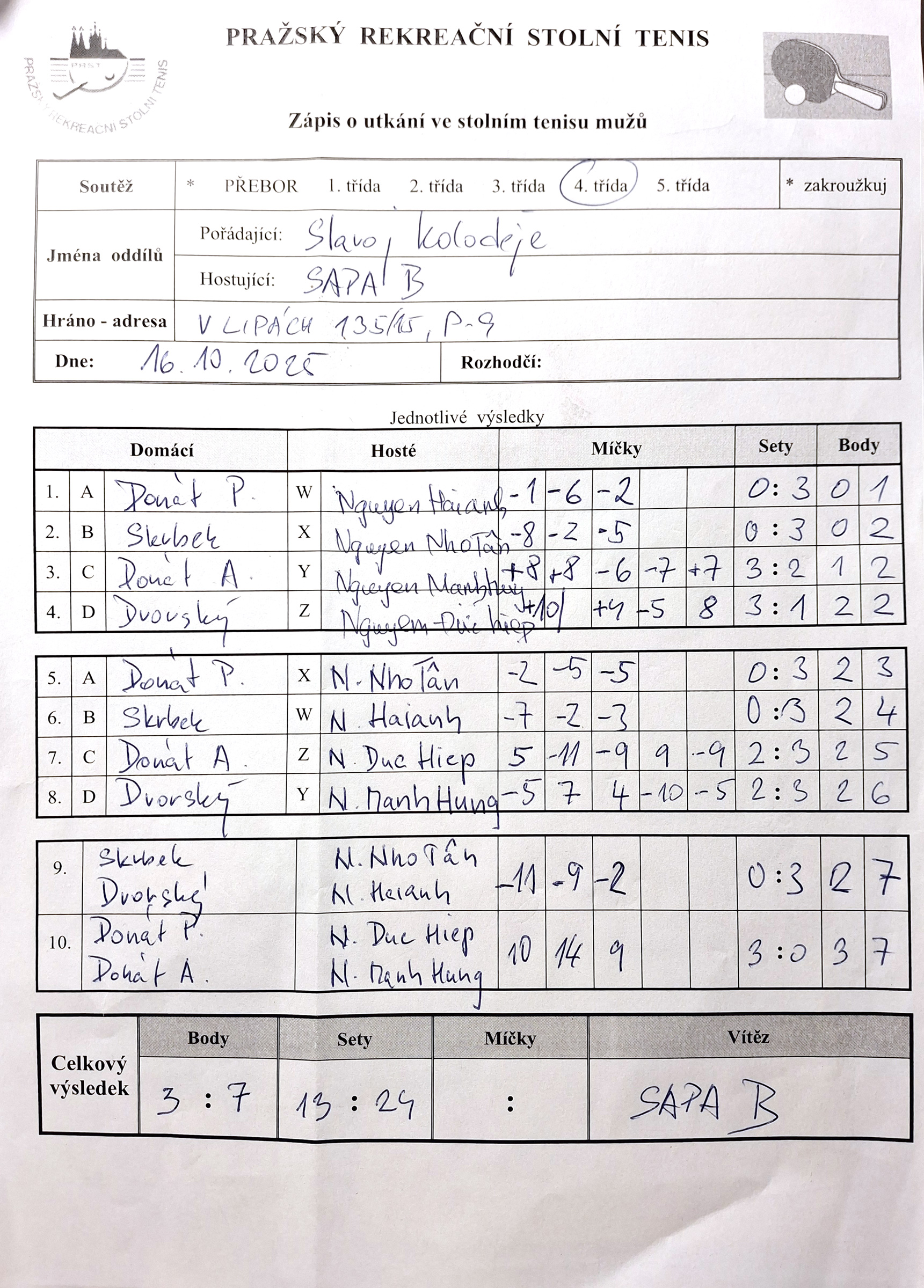 | 24/3 | SAPA A | Slavoj Koloděje | email: DOM HOS | čt 02.04.2026 18:00 | | | 02.02.2026 20:58 phan10 |