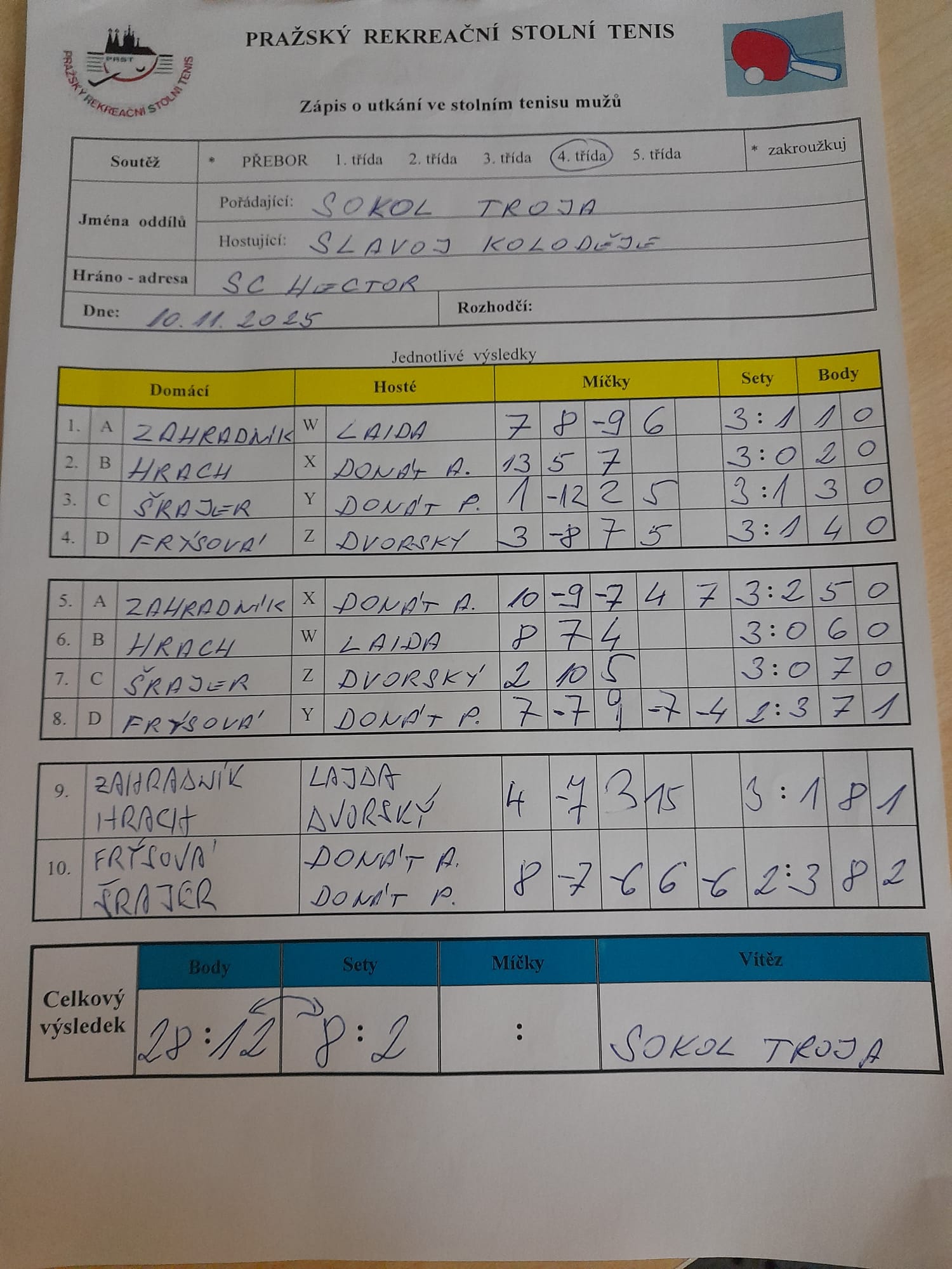 | 8/4 | Sokol Troja | Slavoj Koloděje | 8 : 2 | po 10.11.2025 19:00 | | | 11.11.2025 12:26 radek. |