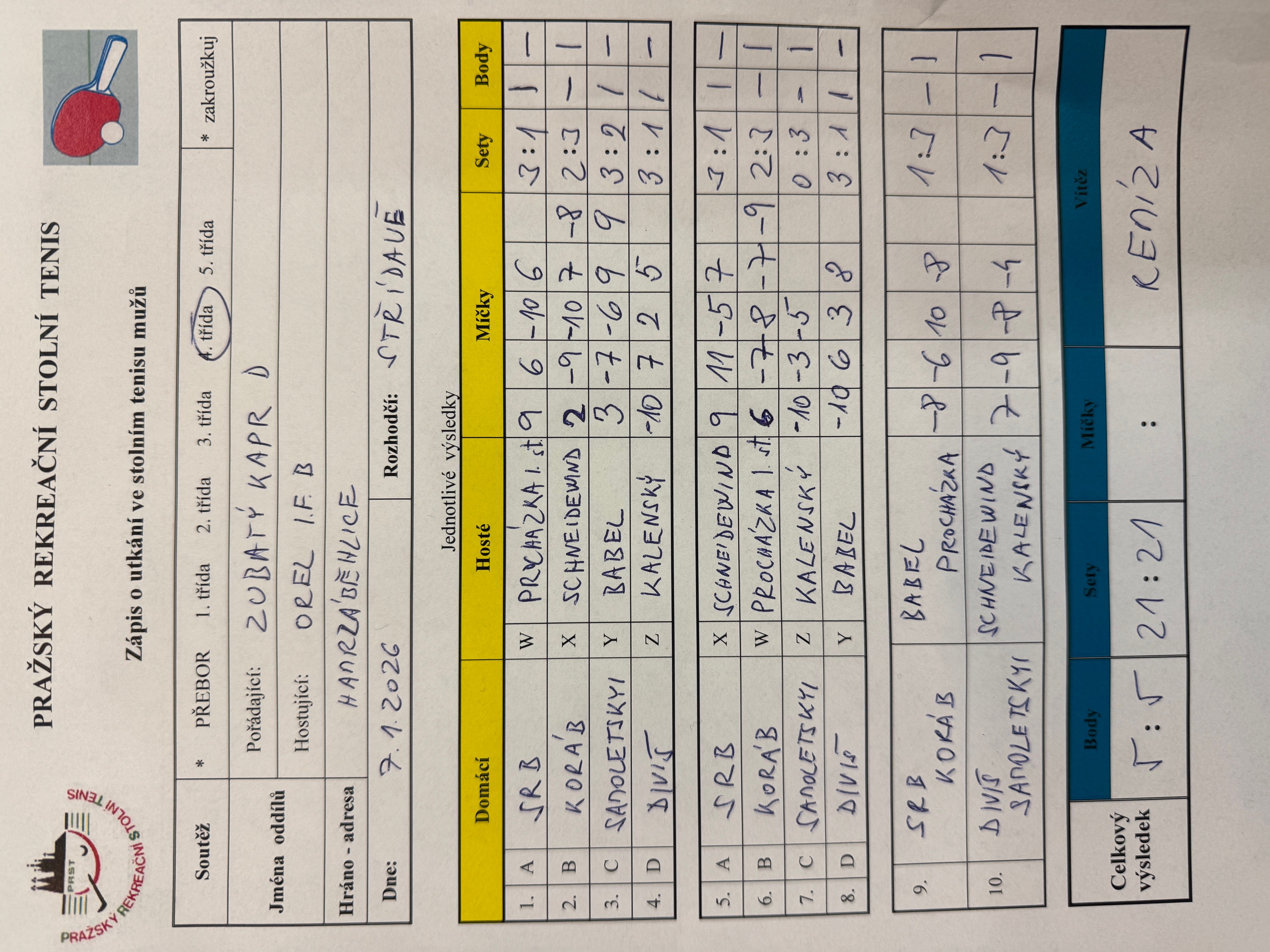 | 12/4 | Zubatý kapr D | Orel I.F. B | 5 : 5 | st 07.01.2026 20:00 | | | 08.01.2026 11:57 odivis |