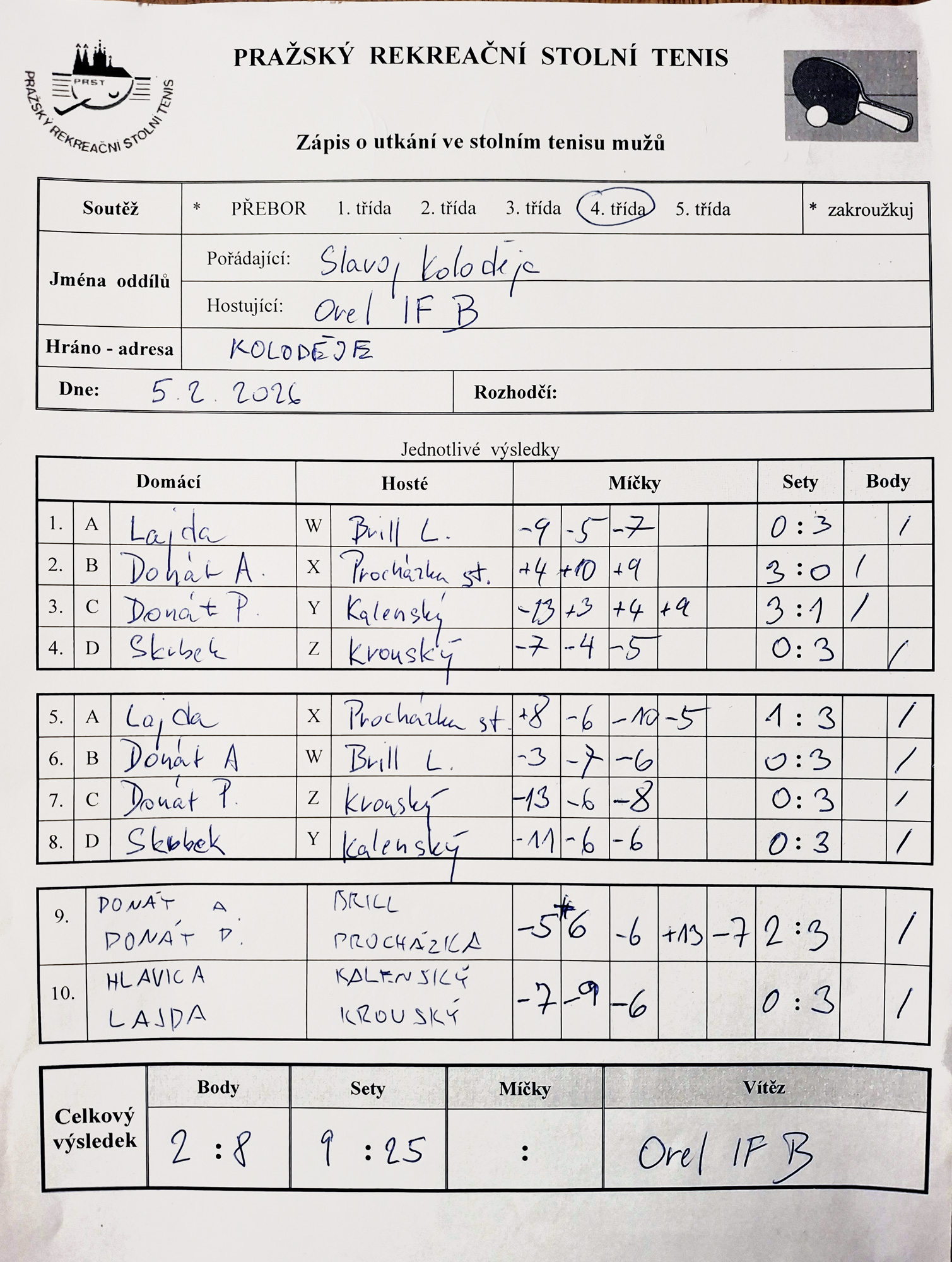| 17/2 | Slavoj Koloděje | Orel I.F. B | 2 : 8 | čt 05.02.2026 18:45 | | | 05.02.2026 23:04 petrdo |