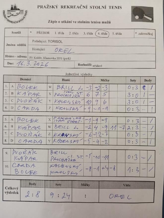| 22/6 | Torisol | Orel I.F. B | 2 : 8 | po 16.03.2026 18:00 | | | 17.03.2026 18:28 kapar. |