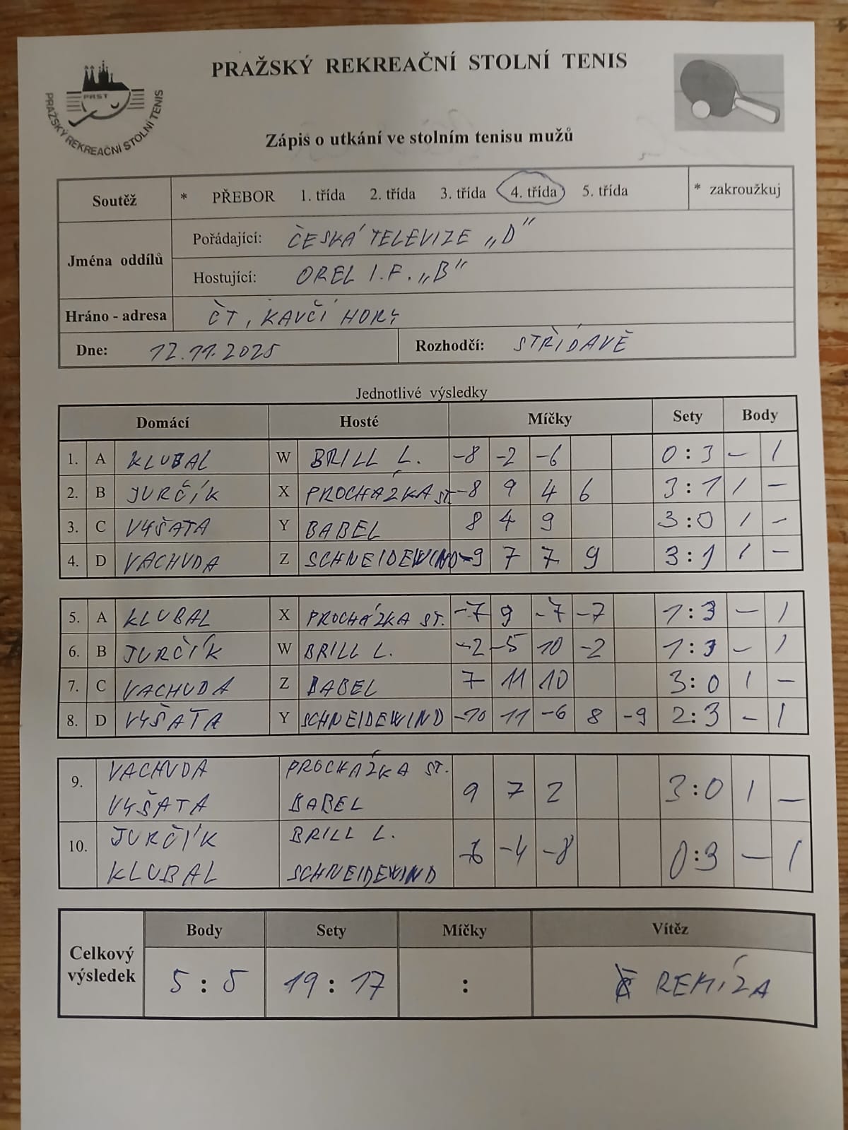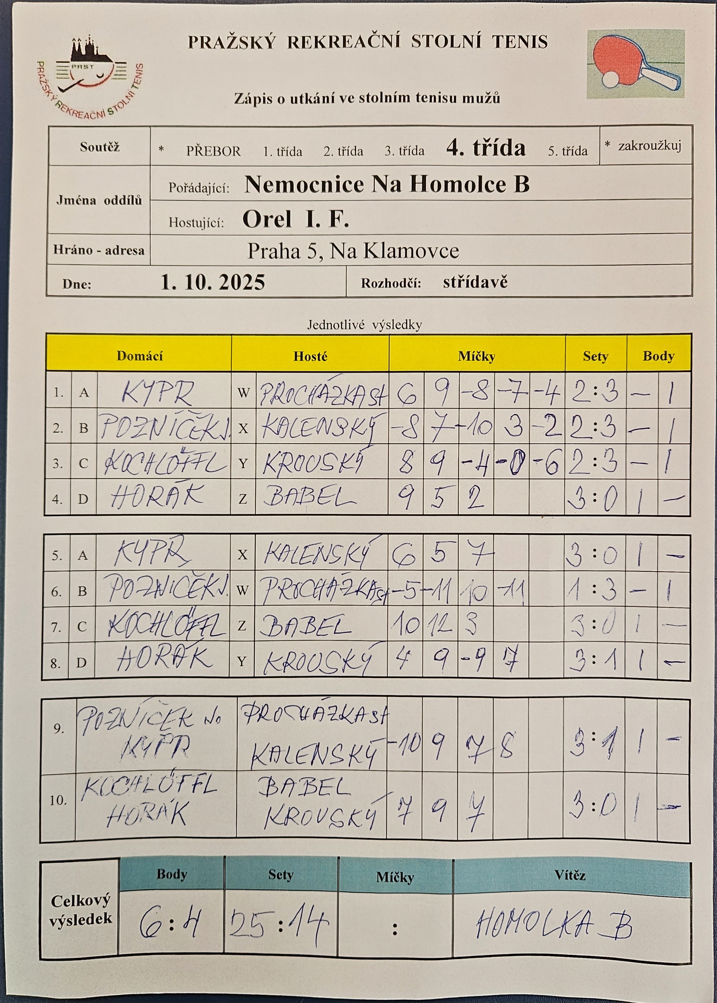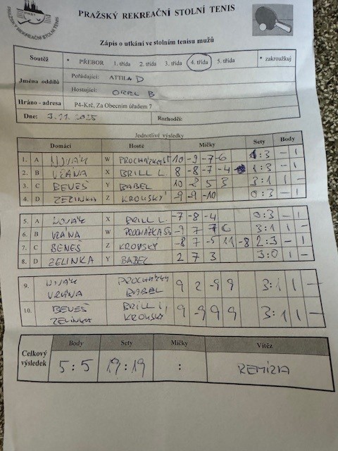 | 5/7 | Attila D | Orel I.F. B | 5 : 5 | po 03.11.2025 18:00 | | | 04.11.2025 12:45 jarosl |