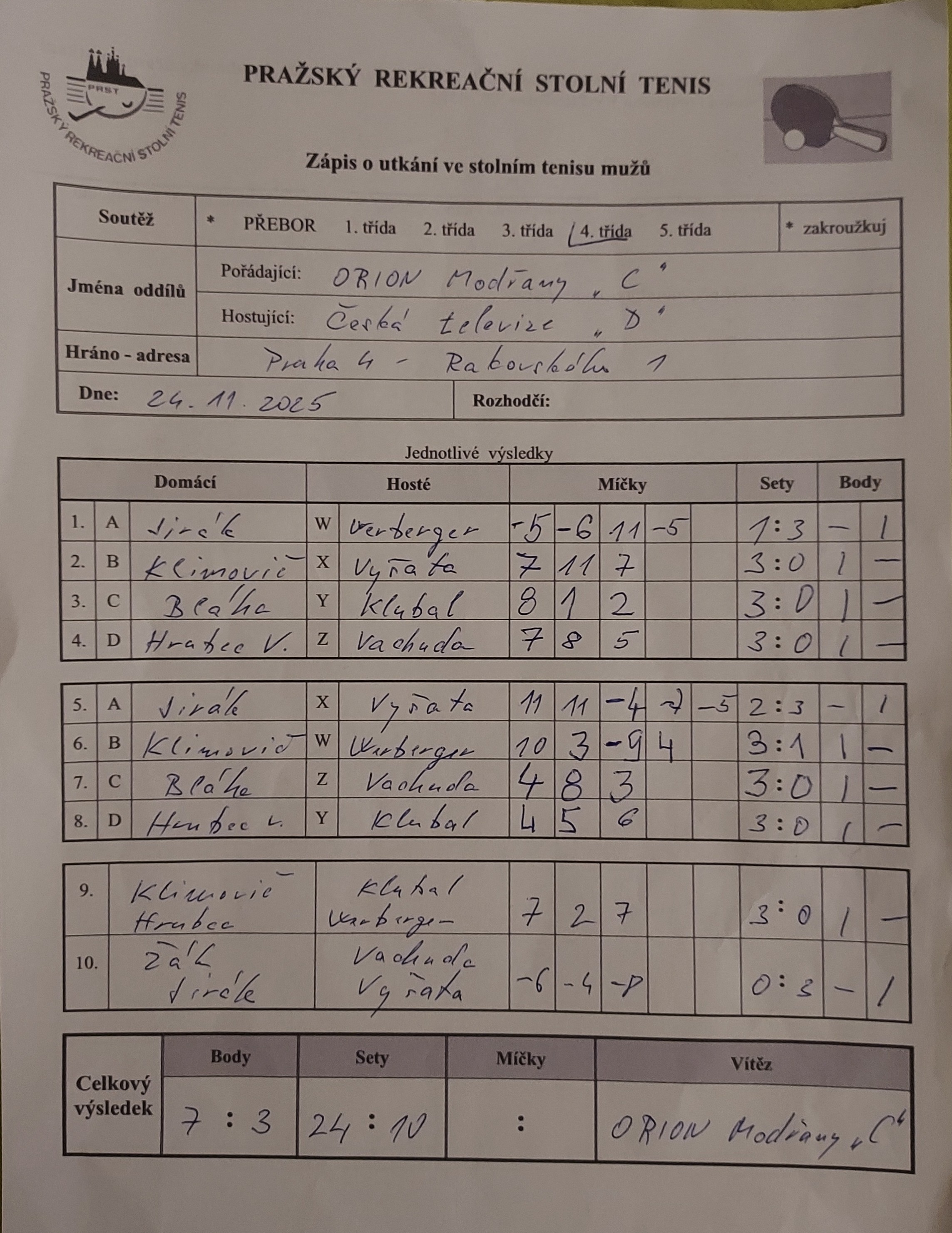 | 10/1 | Orion Modřany C | Česká televize D | 7 : 3 | po 24.11.2025 19:10 | | | 24.11.2025 21:59 jarbla |