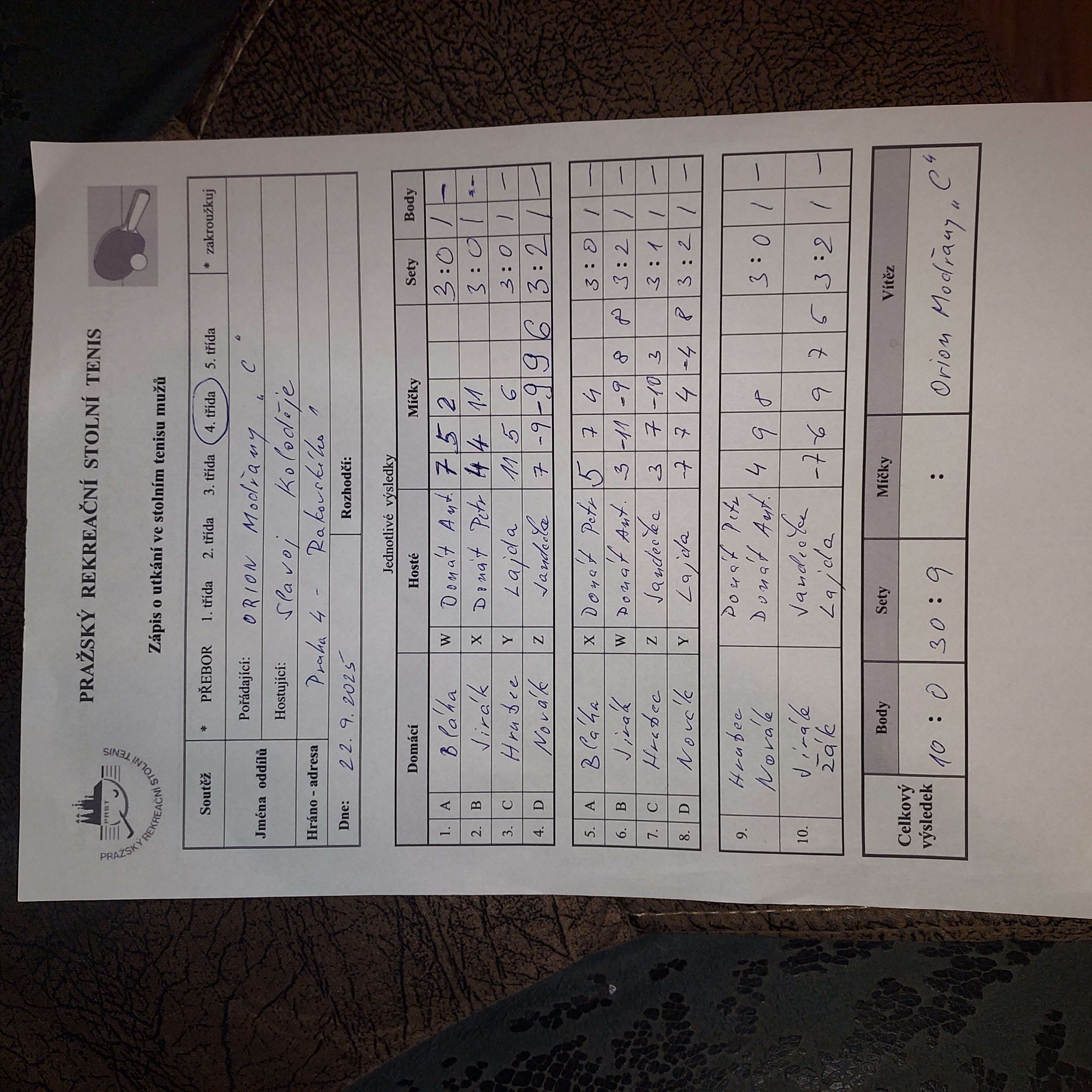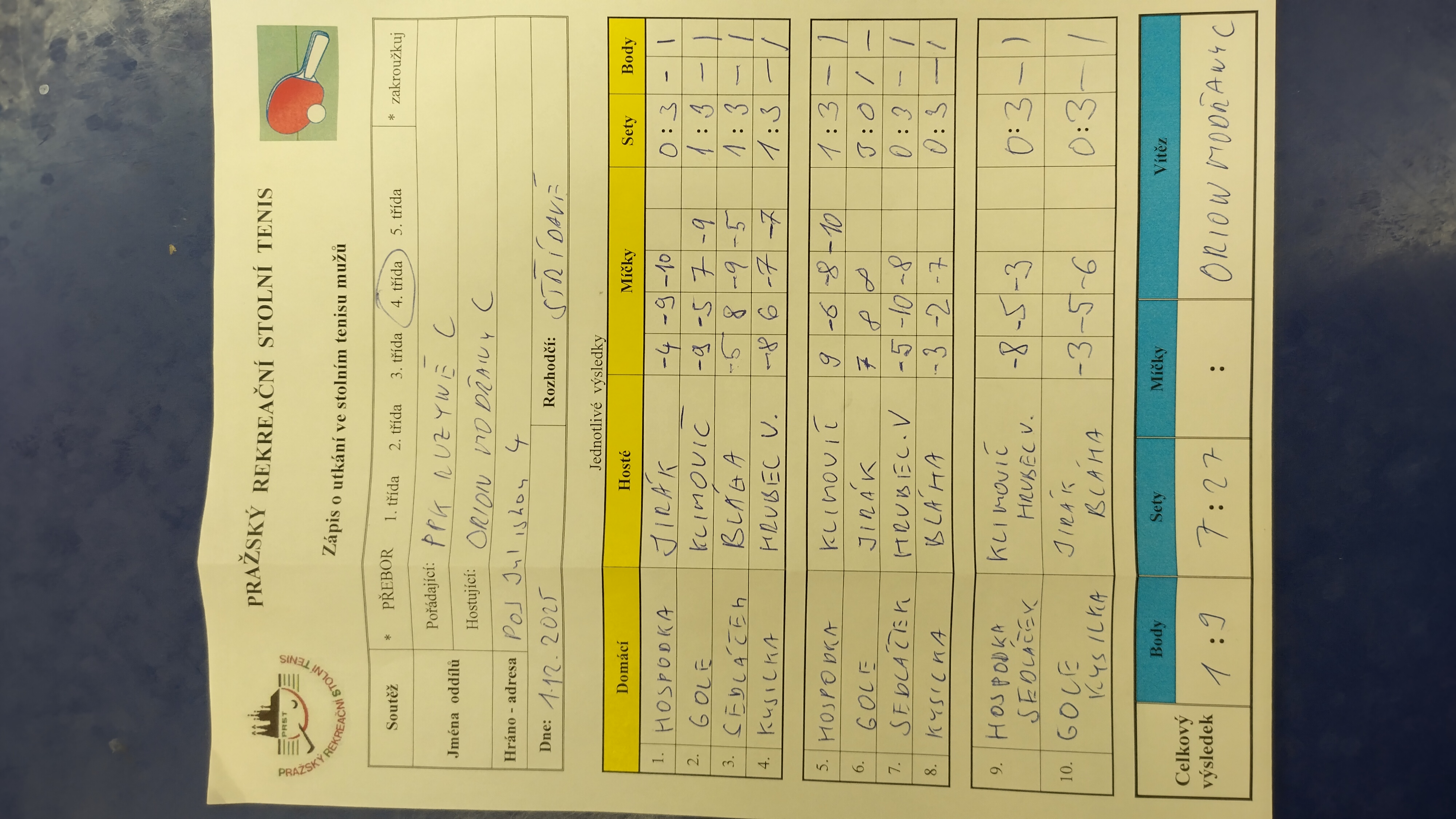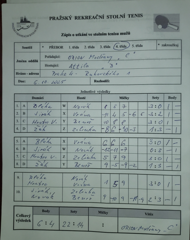 | 4/1 | Orion Modřany C | Attila D | 6 : 4 | po 06.10.2025 19:10 | | | 06.10.2025 23:00 jarbla |