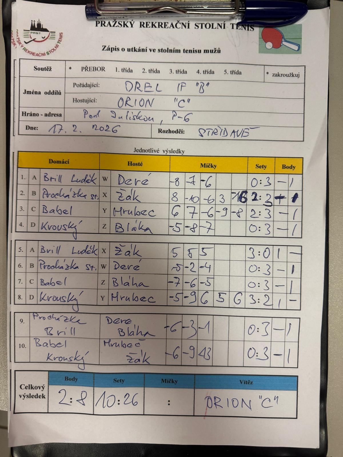 | 19/1 | Orel I.F. B | Orion Modřany C | 2 : 8 | út 17.02.2026 19:15 | | | 17.02.2026 21:04 jarosl |