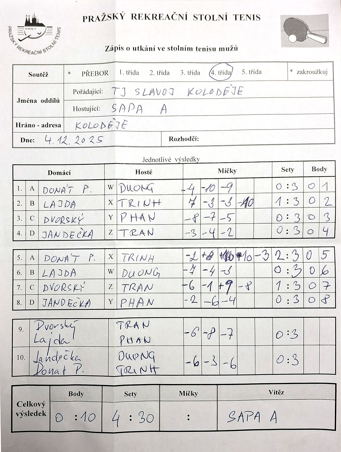 | 12/5 | SAPA A | Attila D | 8 : 2 | čt 11.12.2025 18:00 | | | 11.12.2025 22:16 phan10 |