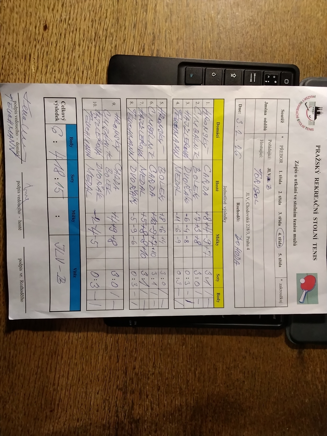 | 17/5 | JLV B | Torisol | 6 : 4 | út 03.02.2026 19:00 | | | 04.02.2026 04:03 ok1mpt |