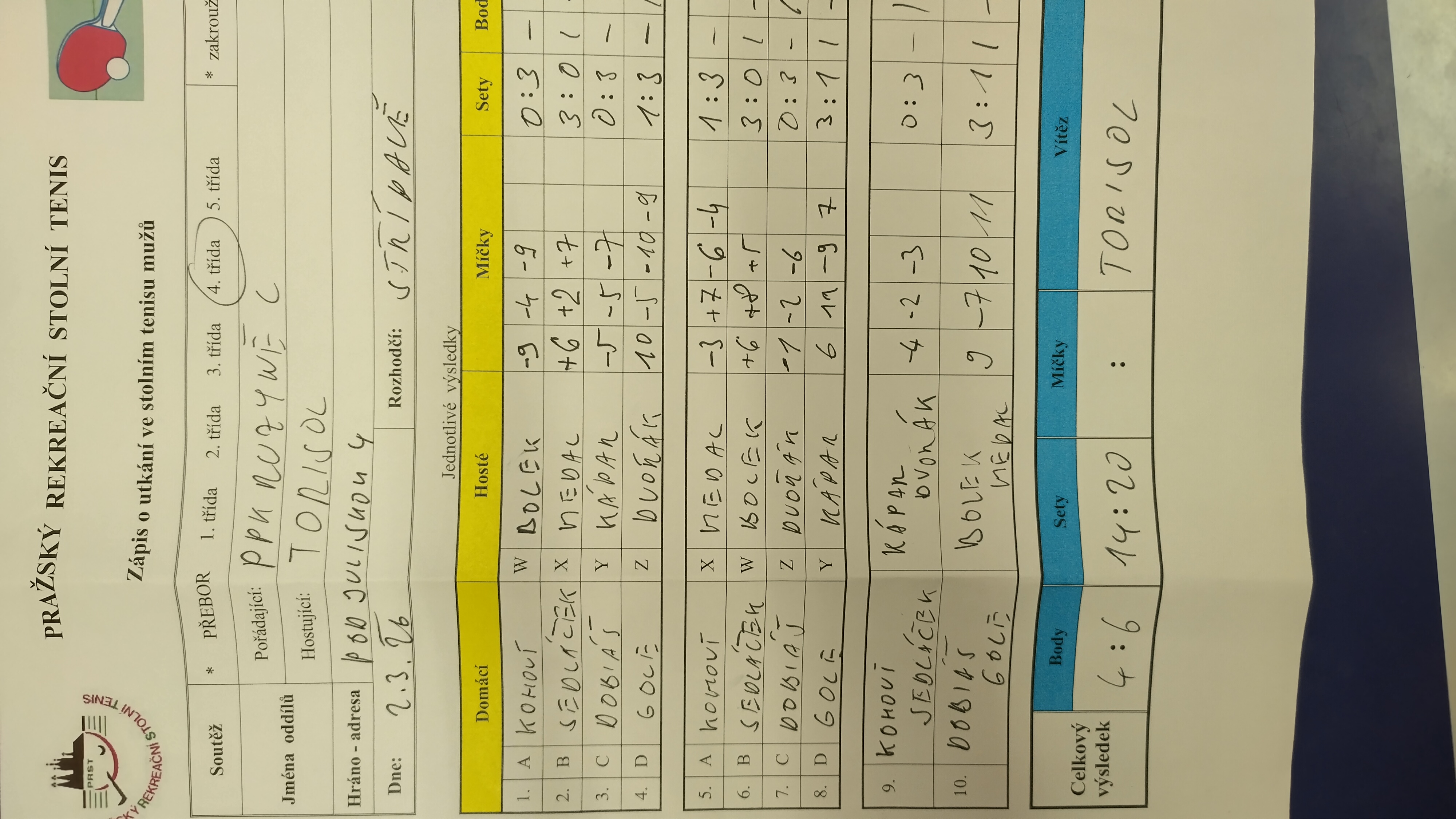 | 18/4 | Torisol | PPK Ruzyně C | 6 : 4 | po 02.03.2026 19:20 | | | 03.03.2026 13:34 radek. |