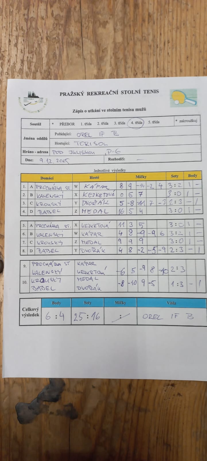 | 9/6 | Orel I.F. B | Torisol | 6 : 4 | út 09.12.2025 19:15 | | | 17.12.2025 12:29 radek. |