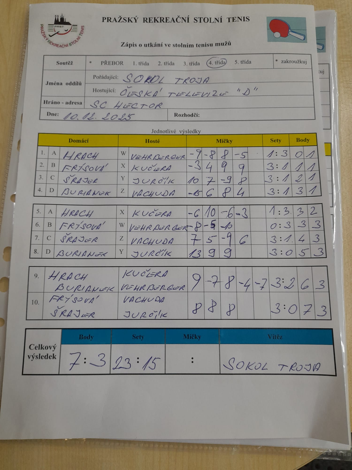 | 13/7 | Torisol | Sokol Troja | 4 : 6 | po 15.12.2025 18:00 | | | 18.12.2025 12:18 radek. |
