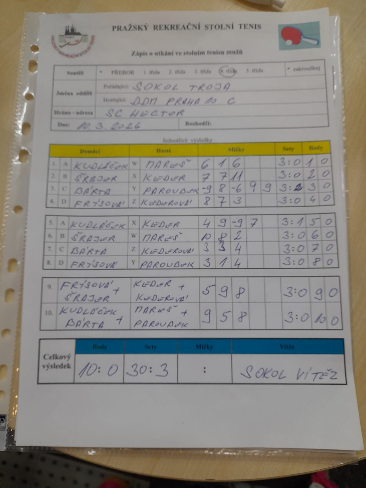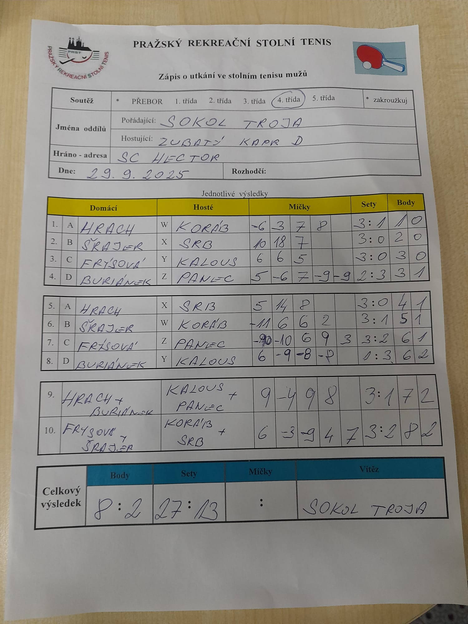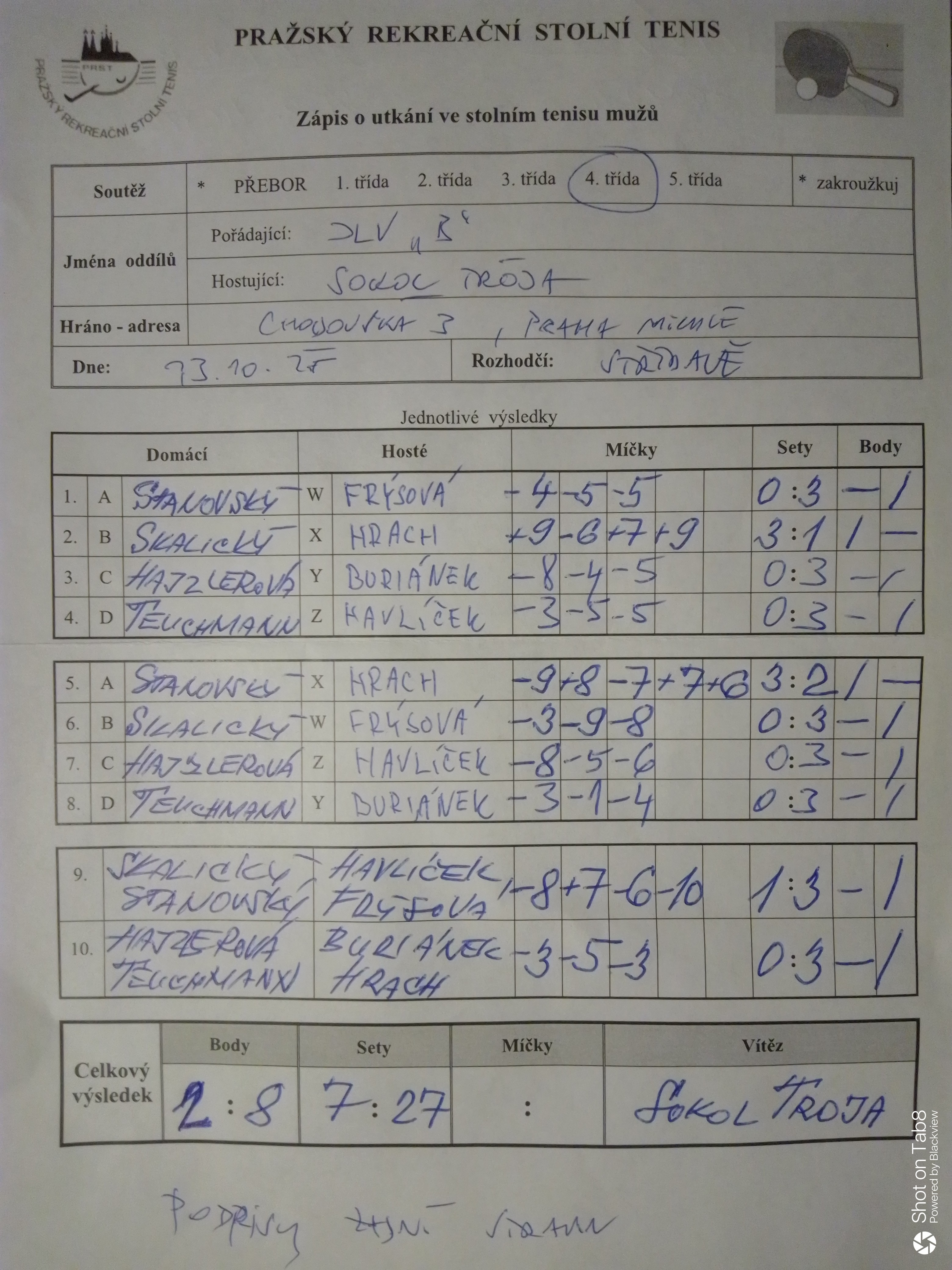 | 22/5 | Sokol Troja | Attila D | 9 : 1 | út 17.03.2026 20:00 | | | 18.03.2026 07:40 havlil |