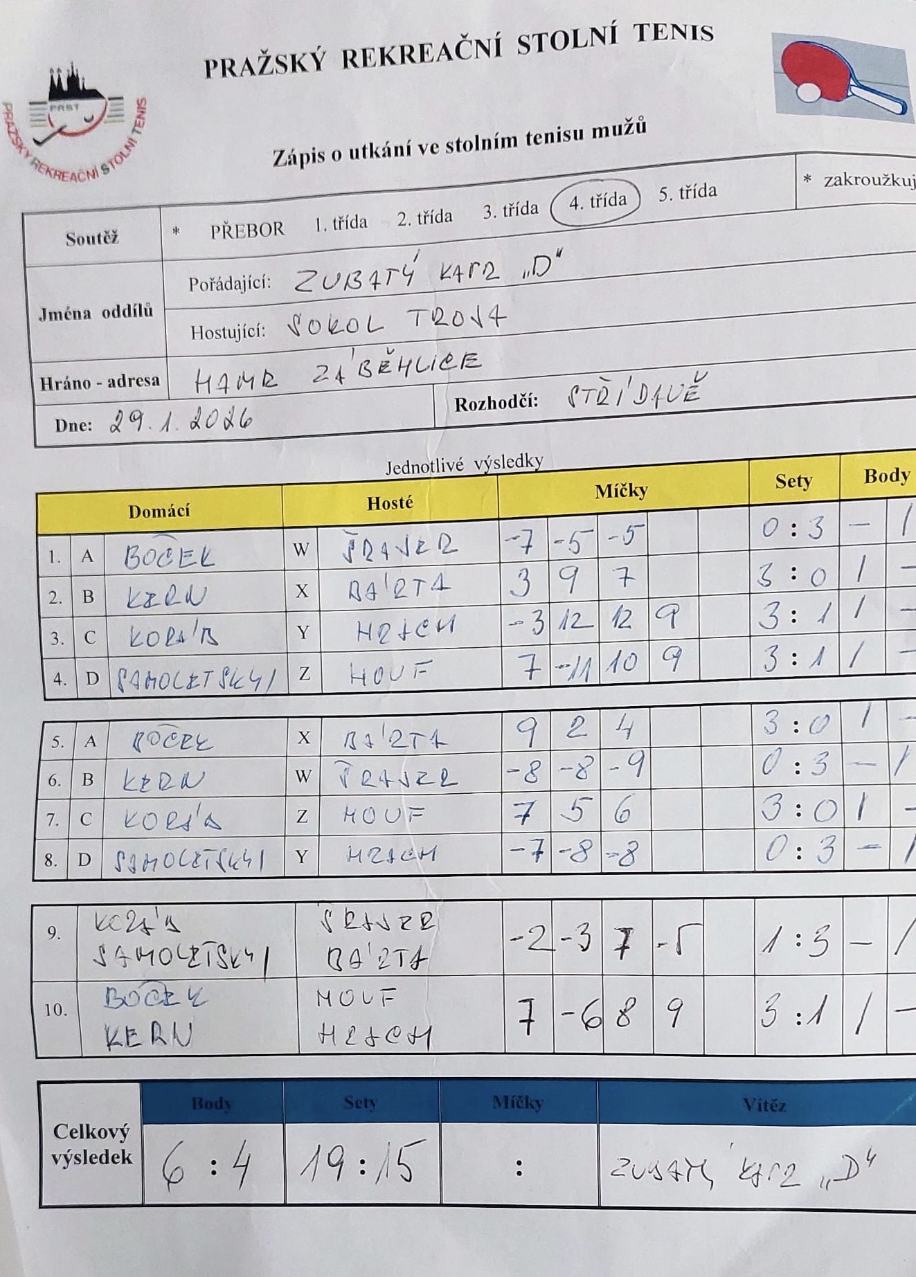 | 16/2 | Sokol Troja | Zubatý kapr D | 4 : 6 | čt 29.01.2026 20:00 | výměna dom.prostředí => herna Zub.kapr | | 30.01.2026 12:26 radek. |
