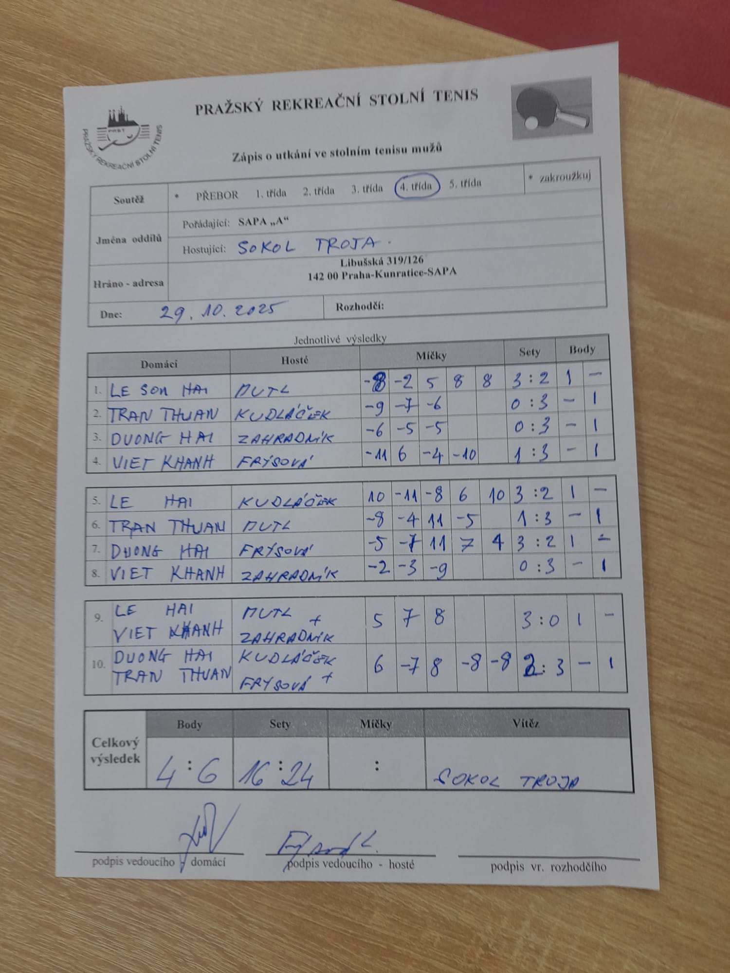 | 4/6 | Sokol Troja | SAPA A | 6 : 4 | st 29.10.2025 18:00 | herna SAPA = výměna dom.prostředí | | 31.10.2025 13:03 radek. |