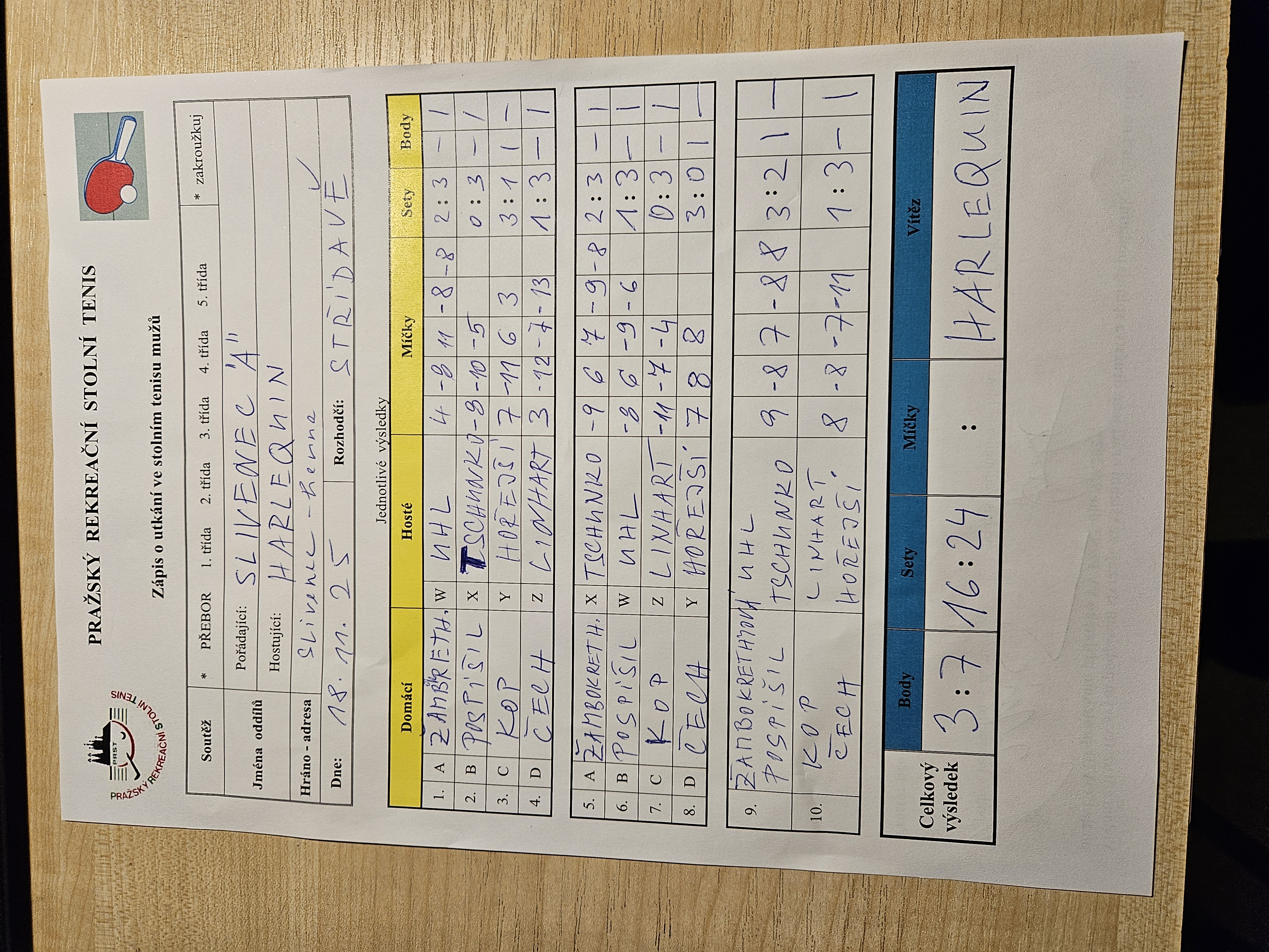 | 14/3 | Harlequin | Šrobárka A | 7 : 3 | po 19.01.2026 18:00 | | | 19.01.2026 21:43 ivan |