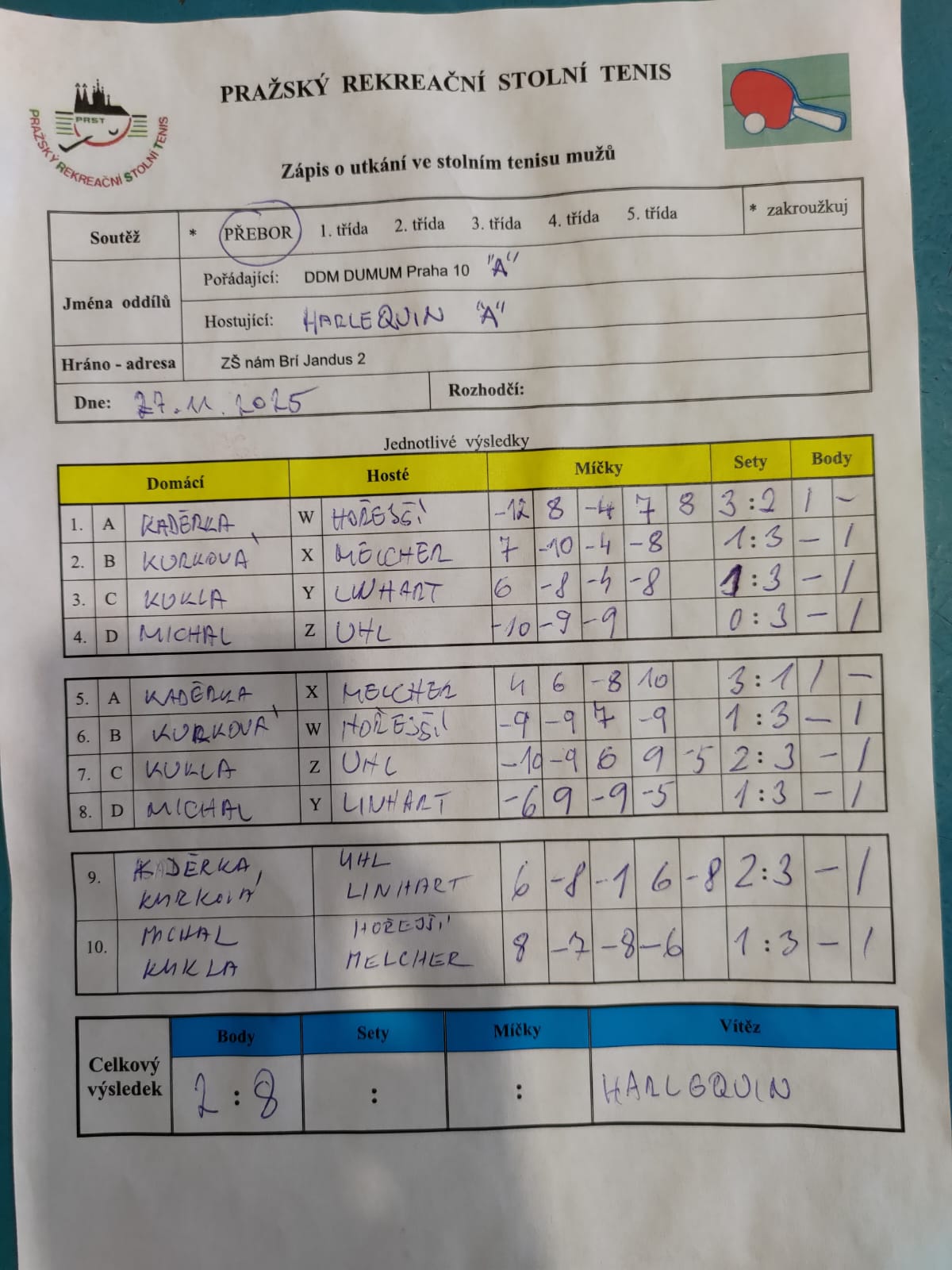 | 9/6 | DDM Praha 10 A | Harlequin | 2 : 8 | čt 27.11.2025 20:00 | | | 28.11.2025 12:52 jaromi |