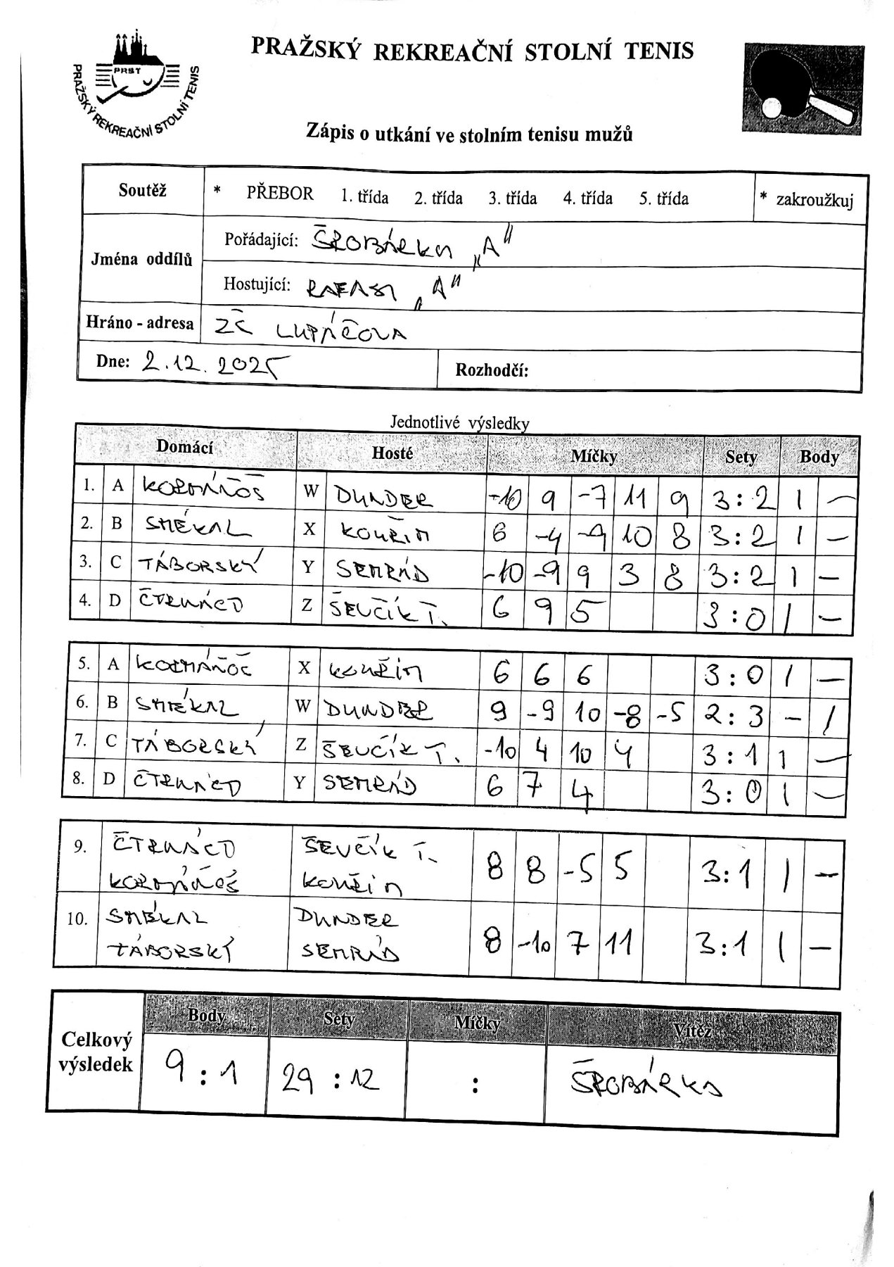 | 10/5 | Šrobárka A | RAFASI A | 9 : 1 | út 02.12.2025 19.00 | | | 02.12.2025 22:30 smekal |