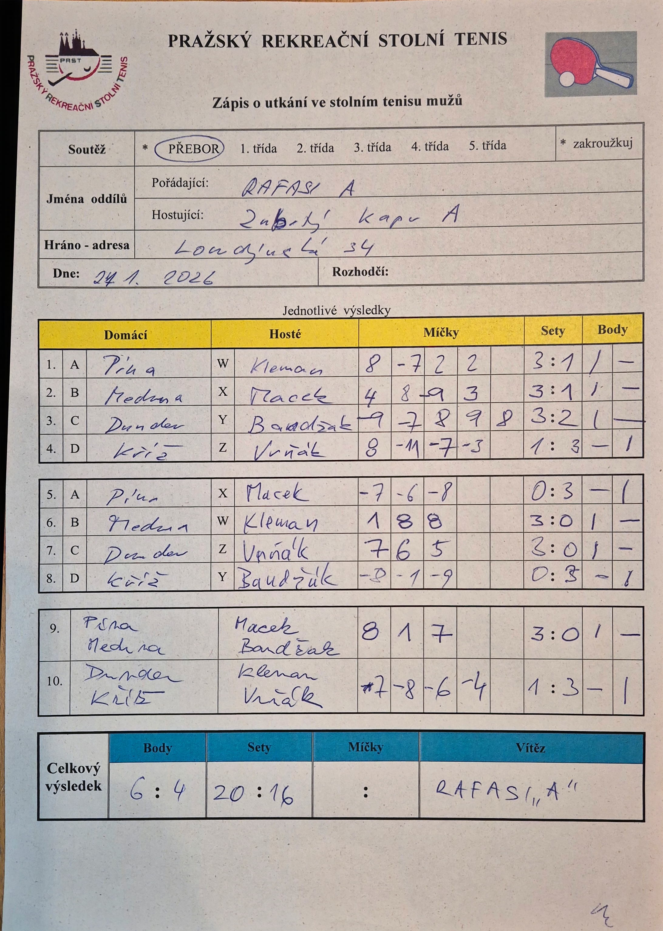 | 13/1 | RAFASI A | PPK Ruzyně A | 5 : 5 | út 13.01.2026 20:00 | | | 14.01.2026 09:15 tom.se |