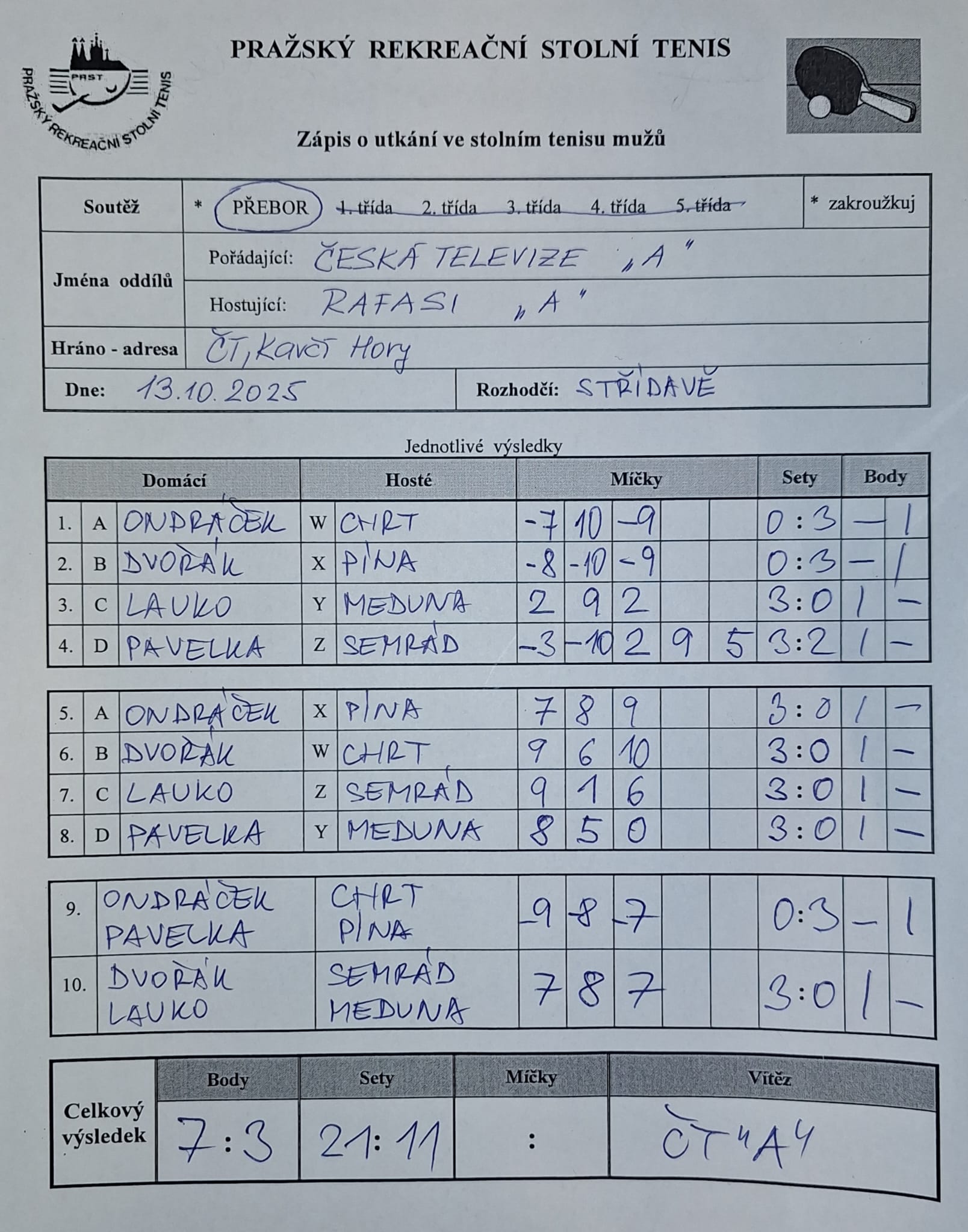 | 7/1 | RAFASI A | Orion Modřany A | 3 : 7 | út 04.11.2025 20:00 | | | 05.11.2025 08:53 tom.se |