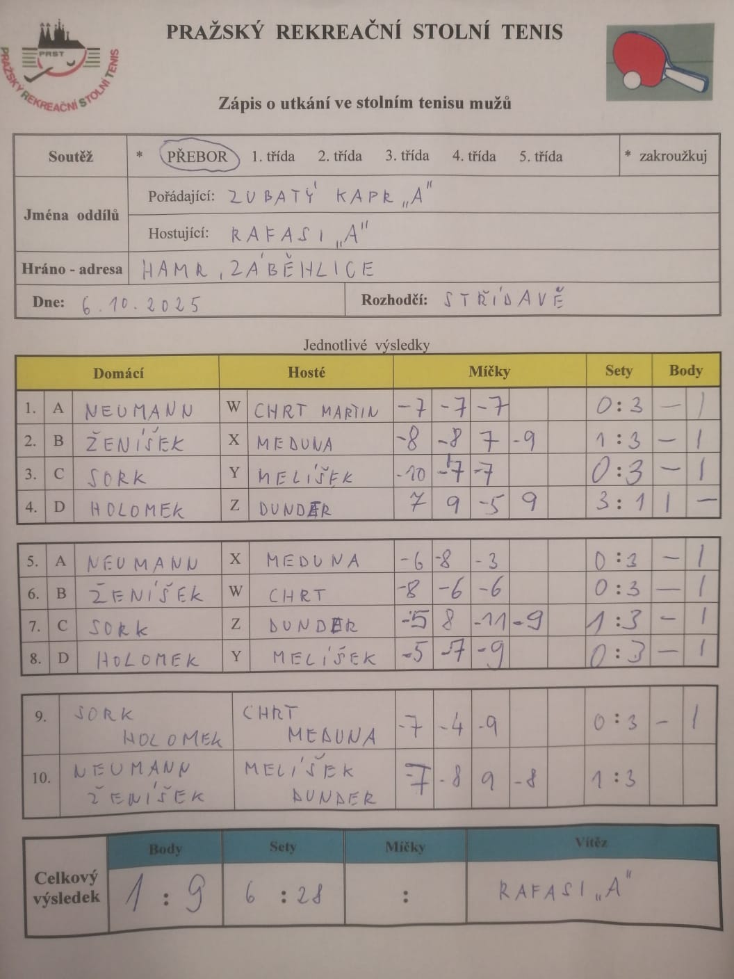 | 5/5 | RAFASI A | DDM Praha 10 A | 6 : 4 | út 21.10.2025 20:00 | | | 22.10.2025 16:18 tom.se |