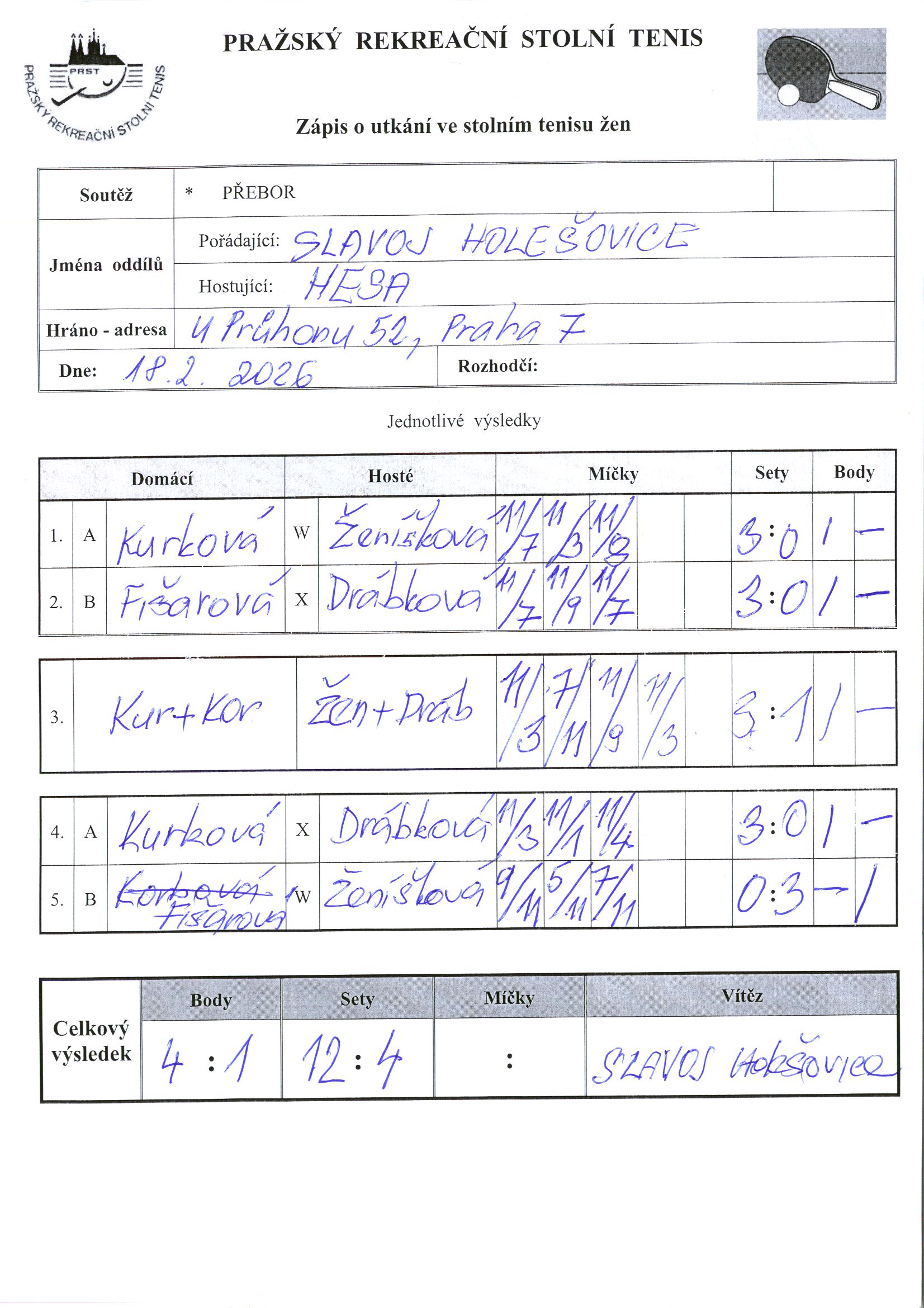 | 14/2 | Slavoj Holešovice | HESA Tuklaty | 4 : 1 | 16.02. - 19.02.+DNT | | | 19.02.2026 23:42 fenclo |