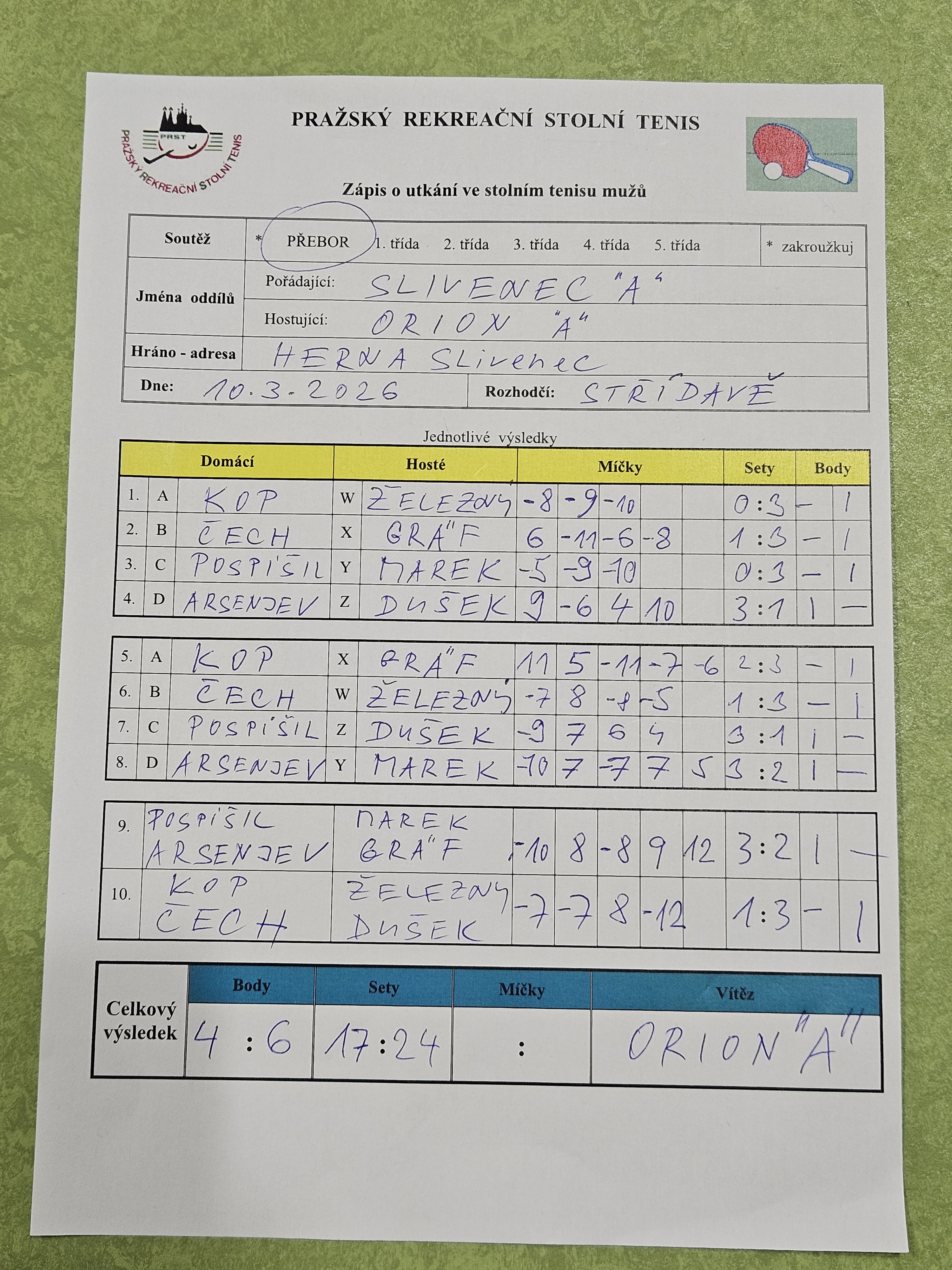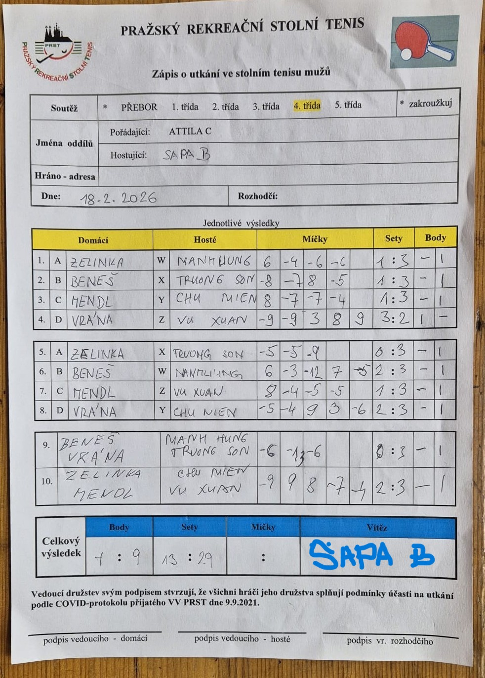 | 19 1 | Slušnej oddíl | Česká televize C | 3 : 7 | | 19 2 | Zubatý kapr B | Tulos Kobylisy | 7 : 3 | | 19 3 | Red Devils | Čakovice | 17.03.26 | | 19 4 | Malešice B | Matuna Dream A | 3 : 7 | | 19 5 | Jižní Město C | Attila B | 9 : 1 | | 19 6 | Pražské služby A | DDM Praha 10 B | 7 : 3 |