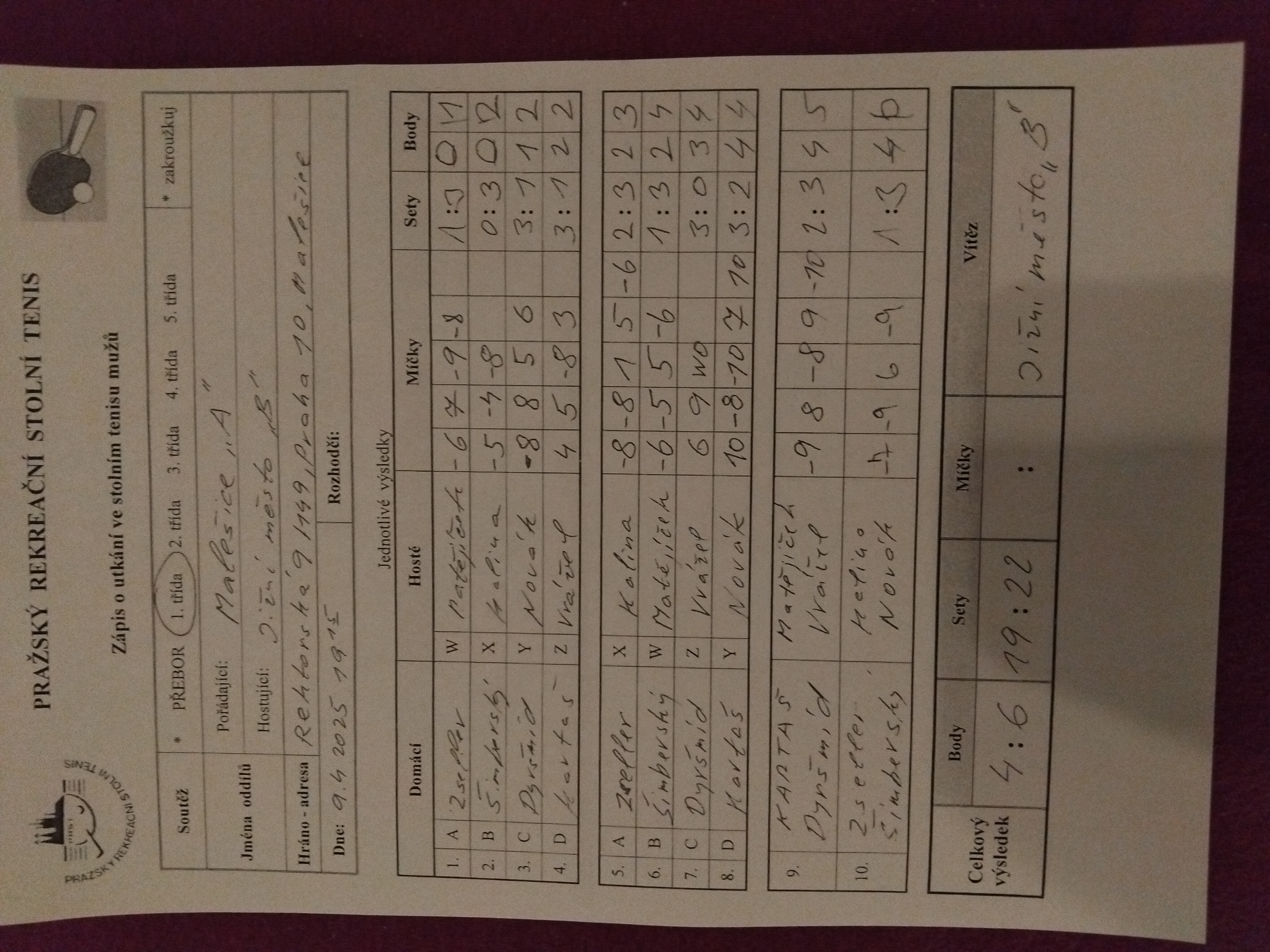 | 1 | JLV A | Malešice A | 3 : 7 | po 08.12.2025 18:00 | | | 09.12.2025 15:17 prst.j |