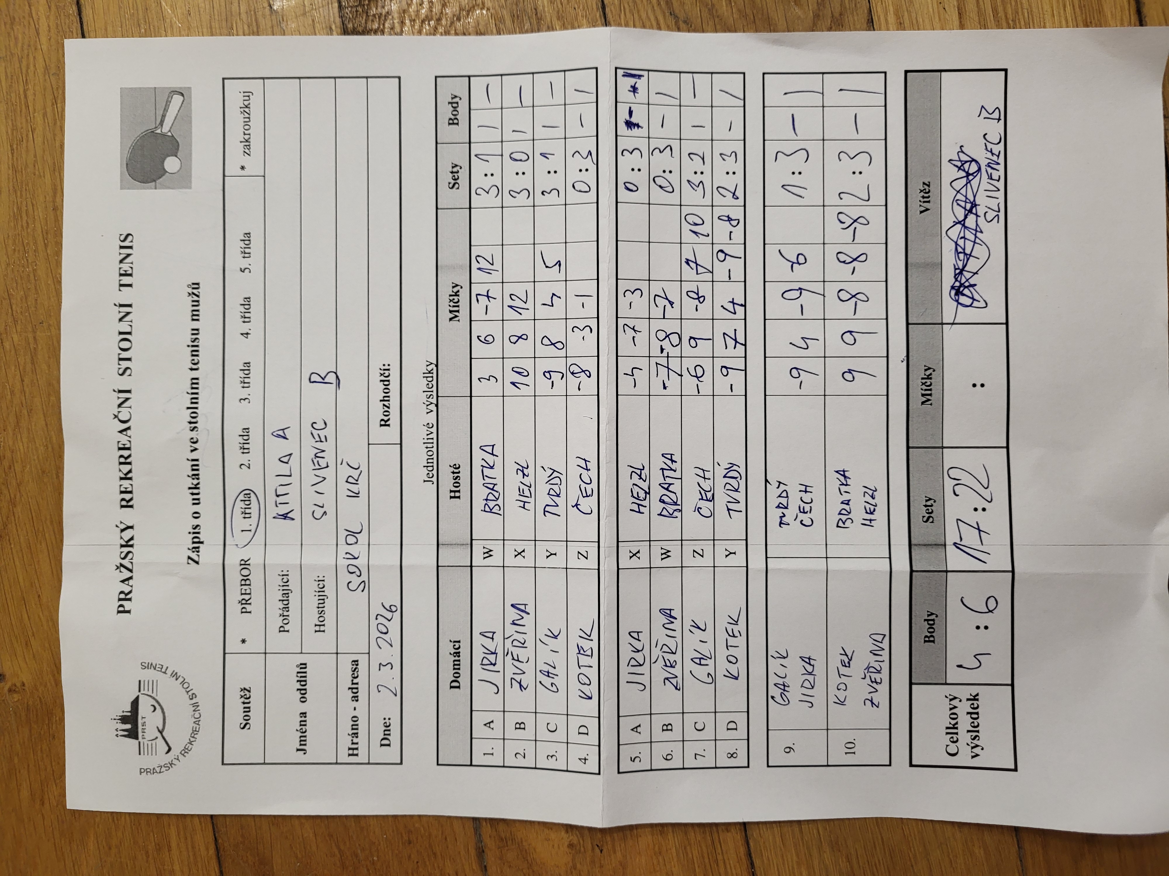 | 18/3 | Attila A | Slivenec B | 4 : 6 | po 02.03.2026 18:00 | | | 02.03.2026 19:39 ondra. |