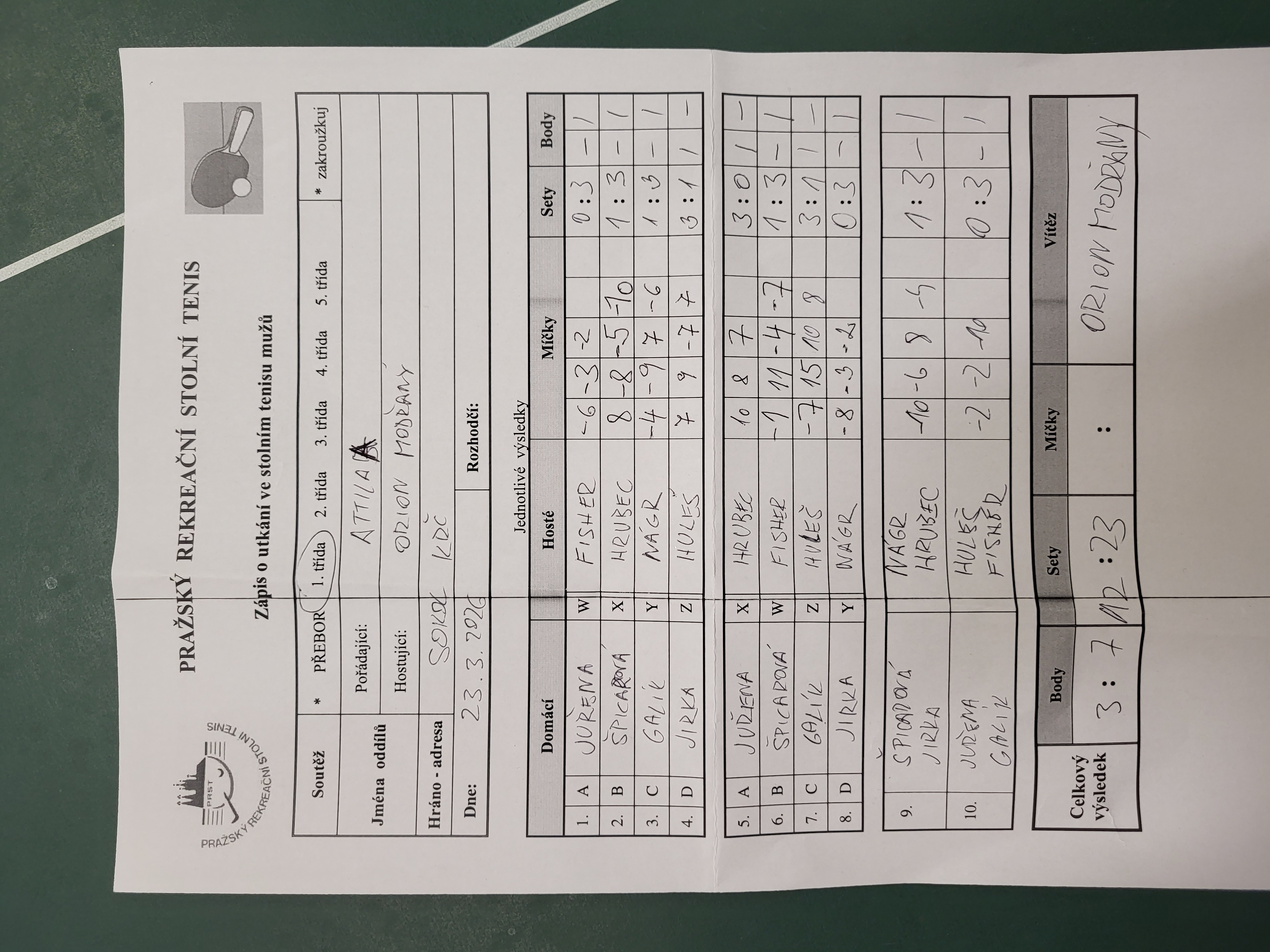 | 20/3 | Attila A | Orion Modřany B | 3 : 7 | po 23.03.2026 18:00 | | | 23.03.2026 19:29 ondra. |